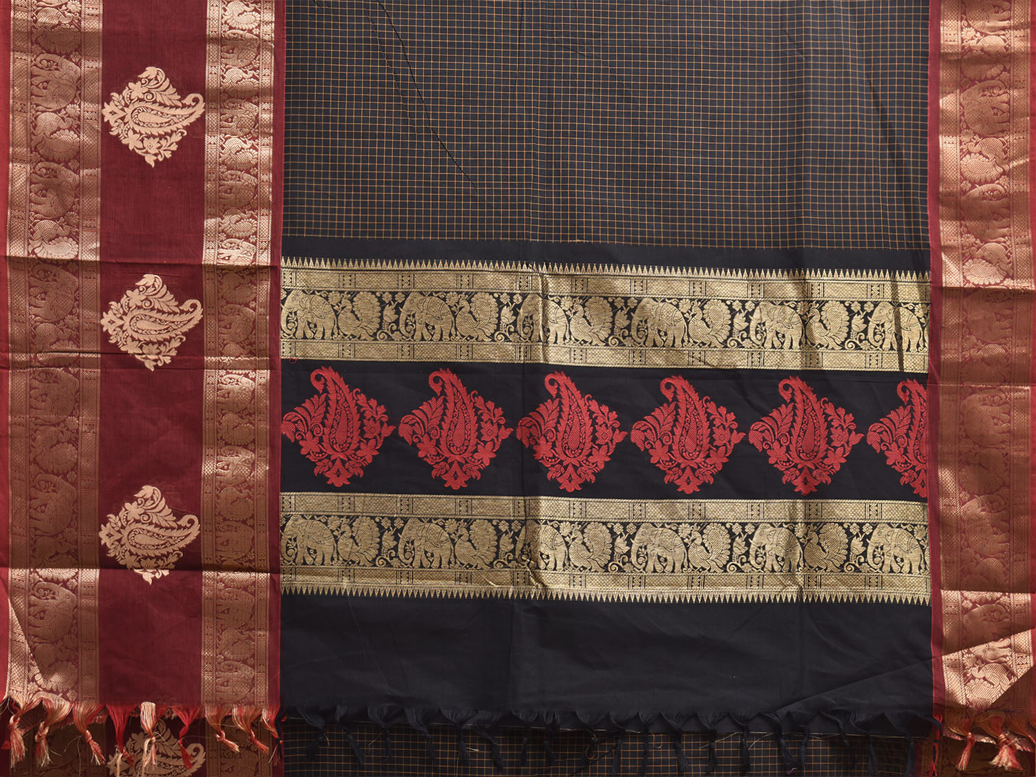 Black and Maroon Kanchipuram Cotton Saree with Checks and Big Border Design k1041