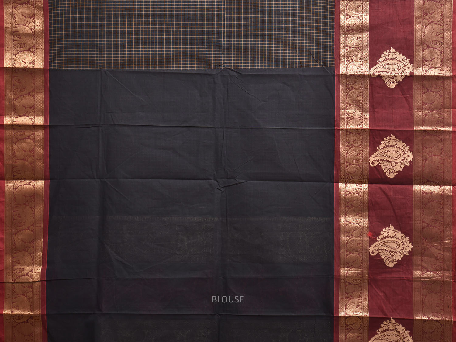 Black and Maroon Kanchipuram Cotton Saree with Checks and Big Border Design. Traditional Simple South Indian Attire Saree for any Casual Occasions. As it’s a cotton saree we advice gentle handwash separately for fabric care.
