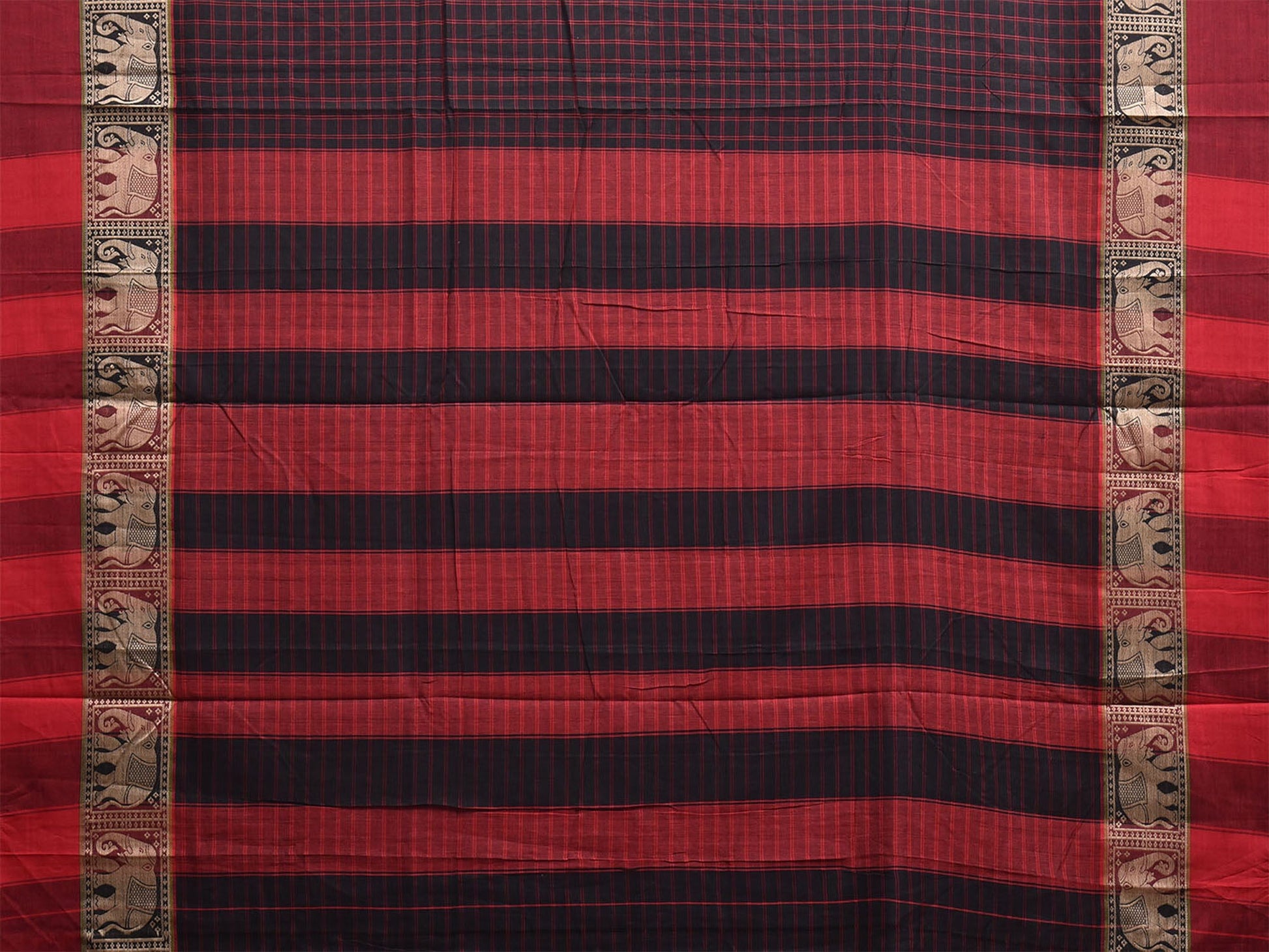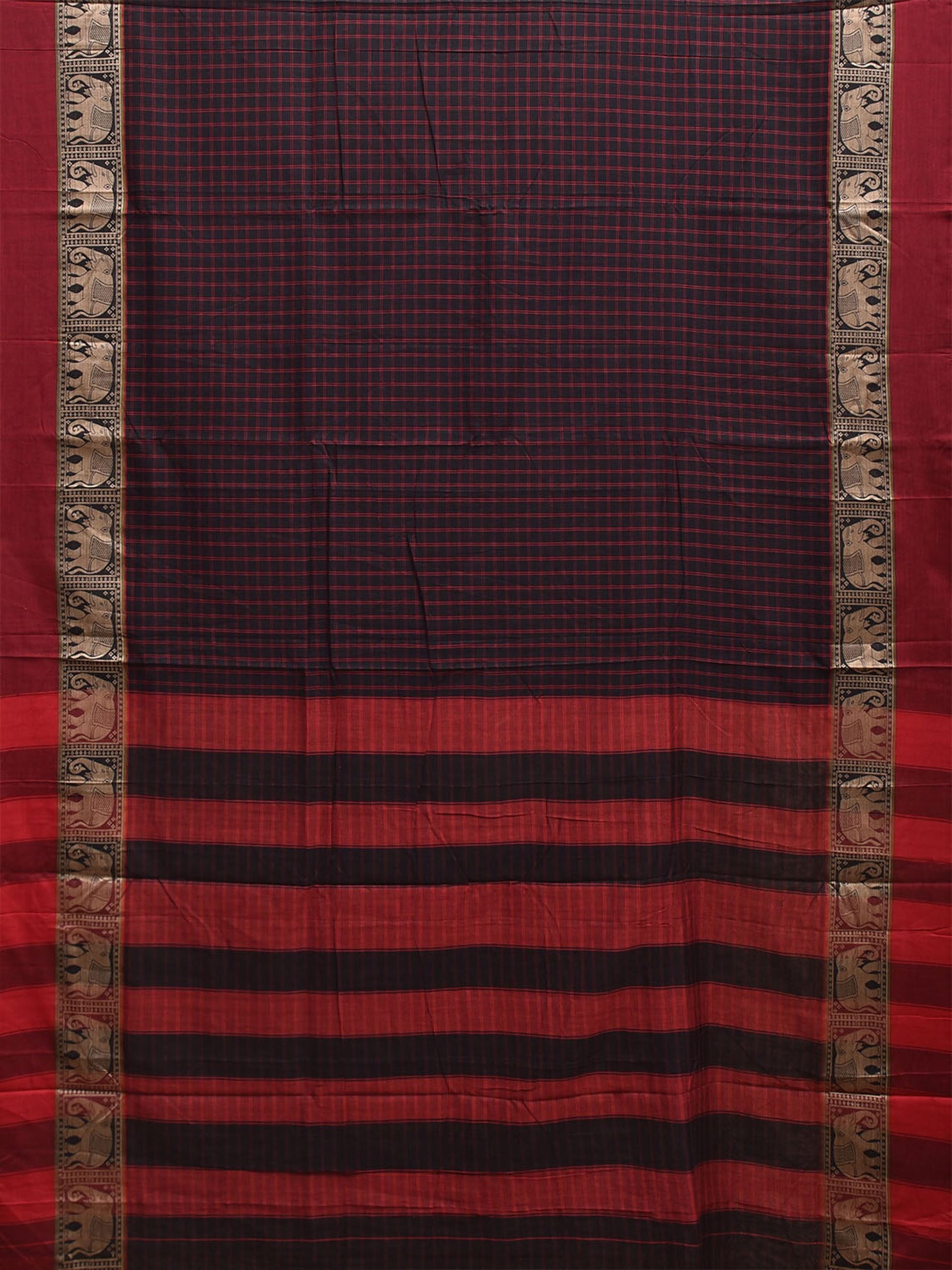 Black and Red Narayanpet Cotton Saree with Checks and Elephant Border Design No Blouse np1494