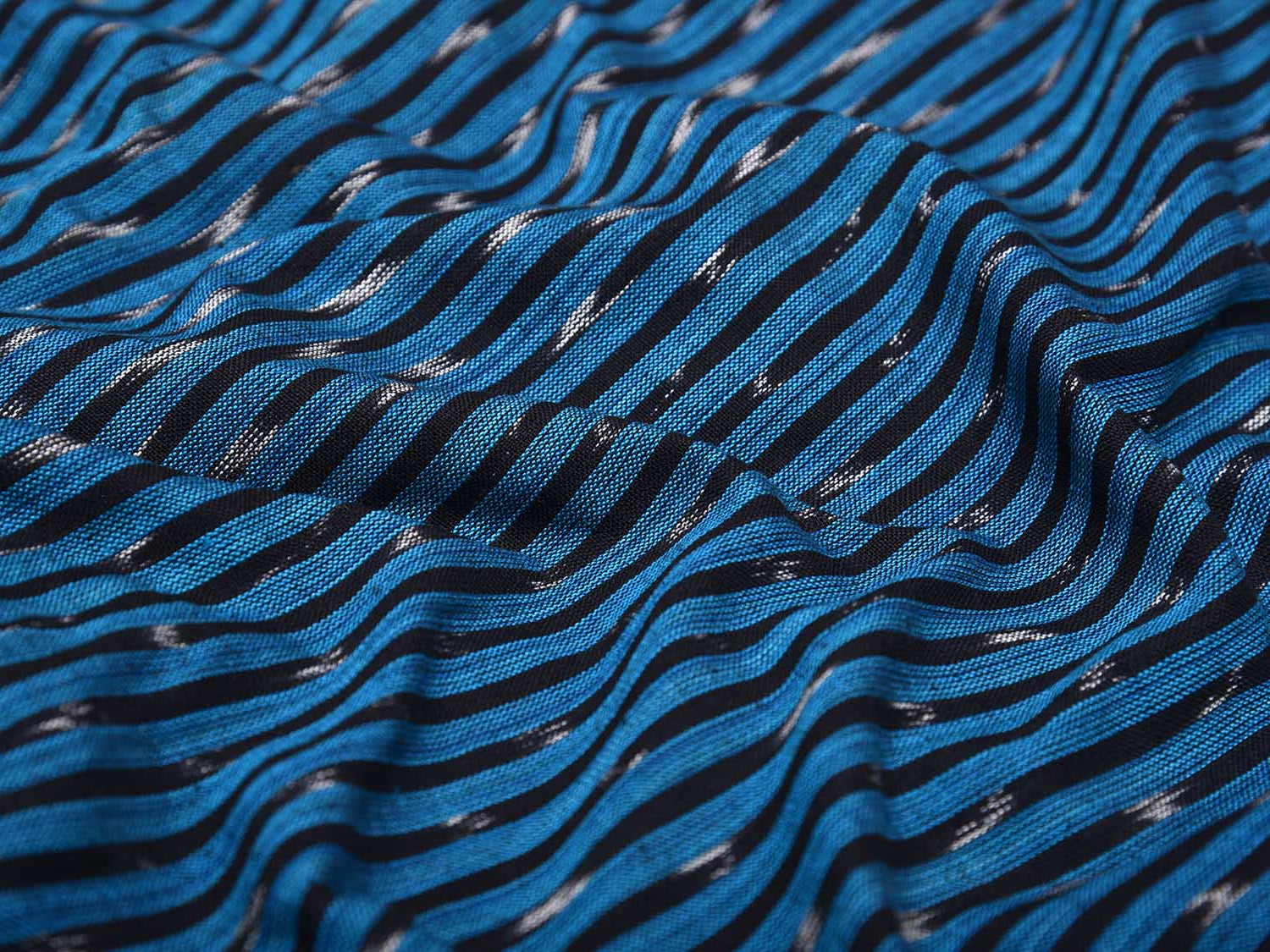 Blue and Black Pochampally Ikat Cotton Handloom 2.5mts Fabric with Strips Design. This Handloom Cotton Fabric from Andhra Pradesh has been woven using the resist-dyeing, which produces the unique patterns adorning the fabric. Fabric is 44 inches in width. The price mentioned is for Quantity 1 = 2.5 meters. Note: Don't wash with other cloths for few times in the beginning.
