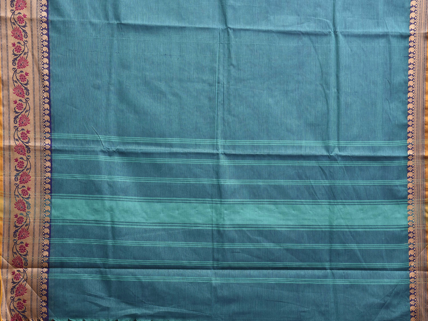 Blue Kanchipuram Cotton Plain Saree with Floral Border Design and Kalamkari Blouse. Traditional Simple South Indian Attire Saree for any Casual Occasions. As it’s a cotton saree we advice gentle handwash separately for fabric care.
