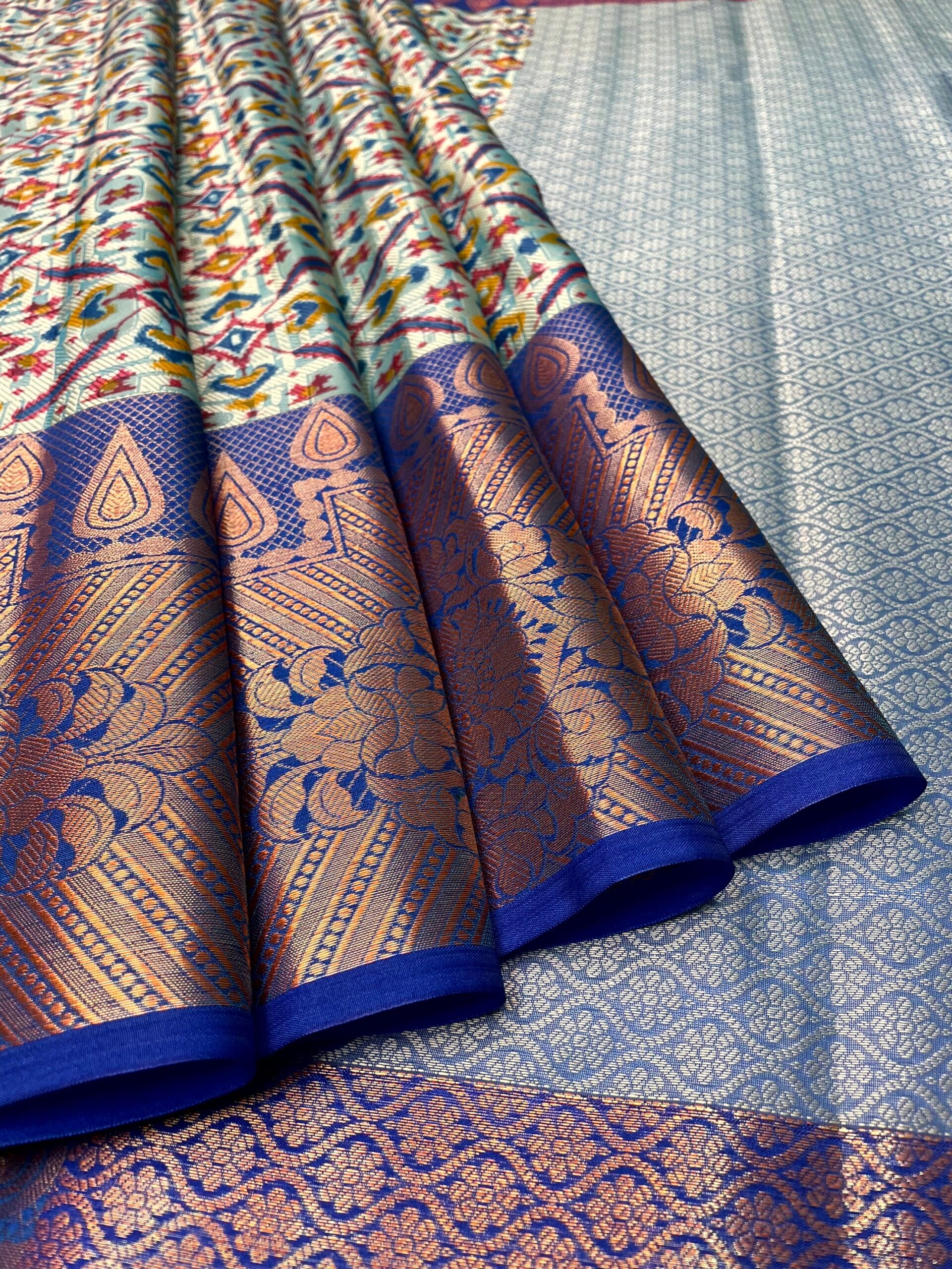 Blue Kora Printed Saree with Contrast Banaras Border and Allover Printed Body Design