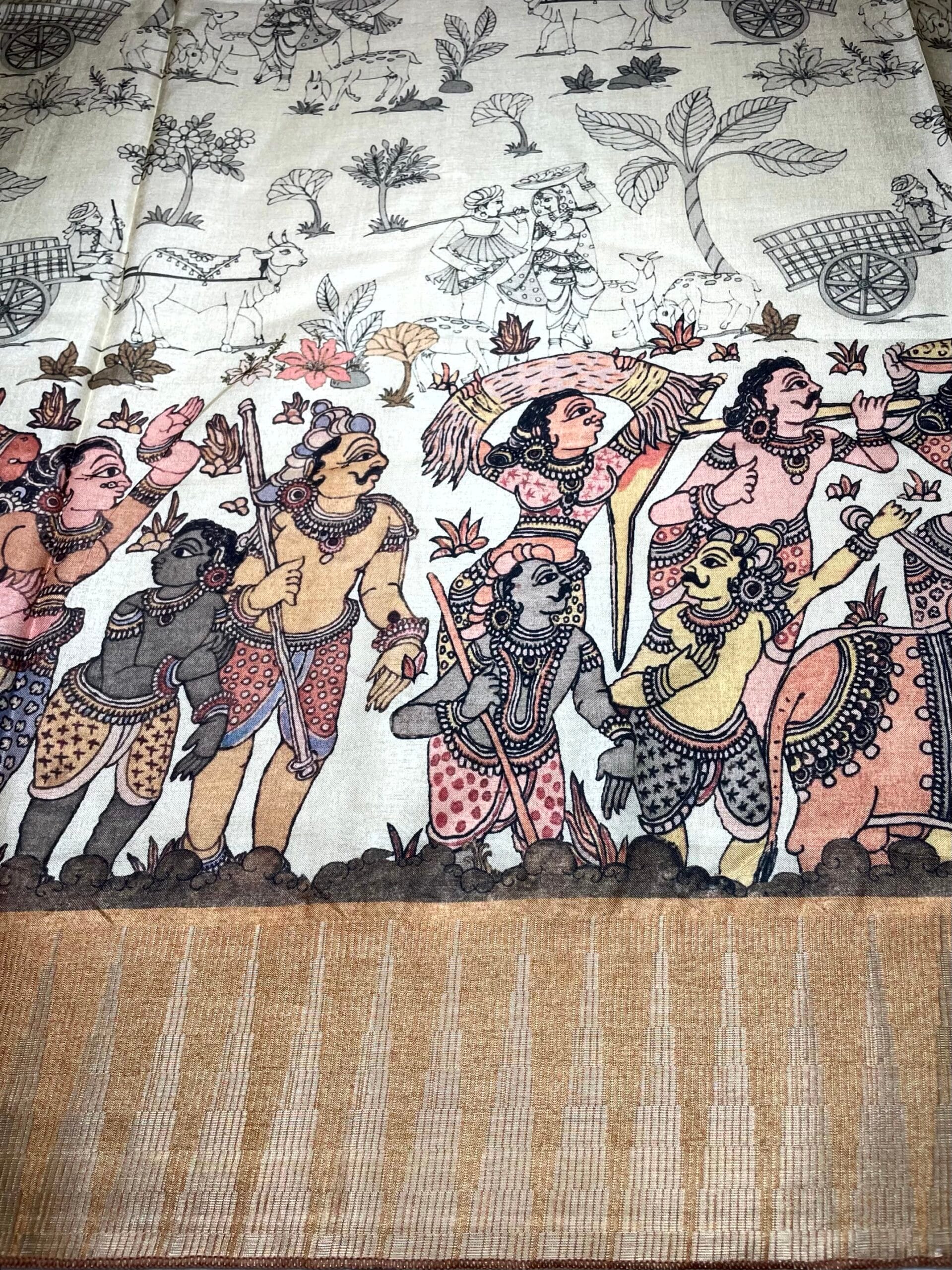 Brown and Cream Digital Printed Viscose Silk Saree with Village Theme Design pr0058ap