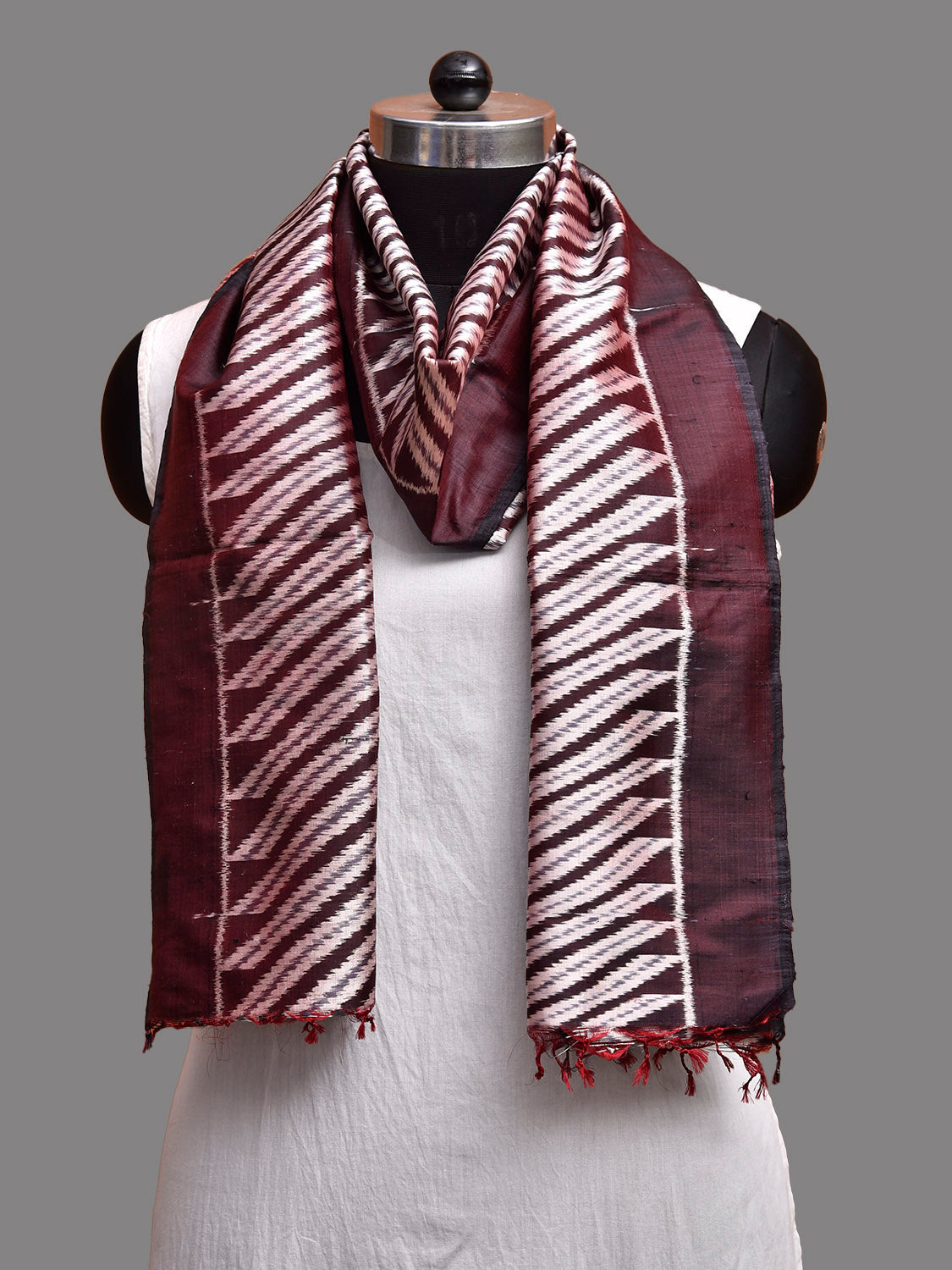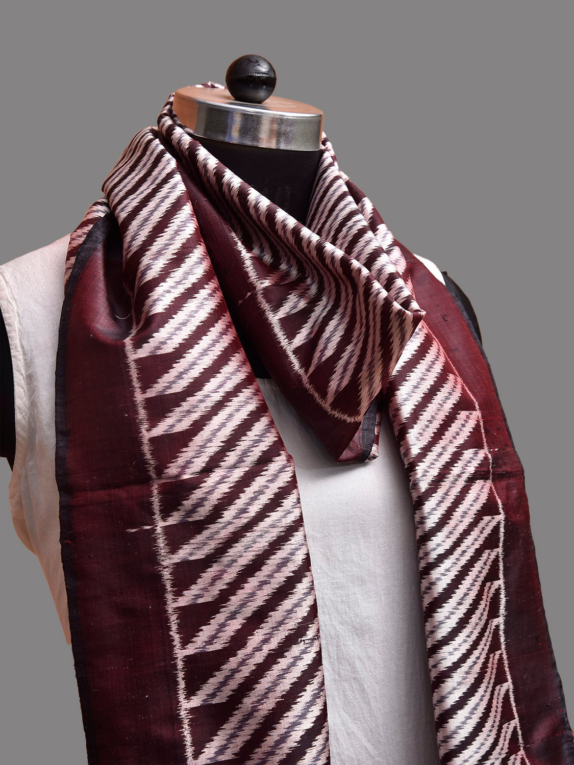 Brown Pochampally Ikat Silk Handloom Stole with Diagonal Design. We Advise Gentle Handwash for Fabric Care.