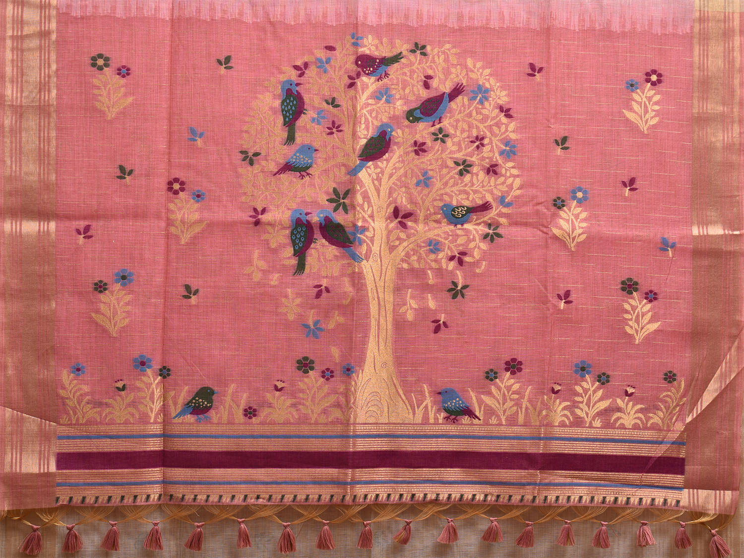Cream and Baby Pink Dhakai Jamdani Cotton Viscose Saree with Tree and Birds Pallu Design dj0055