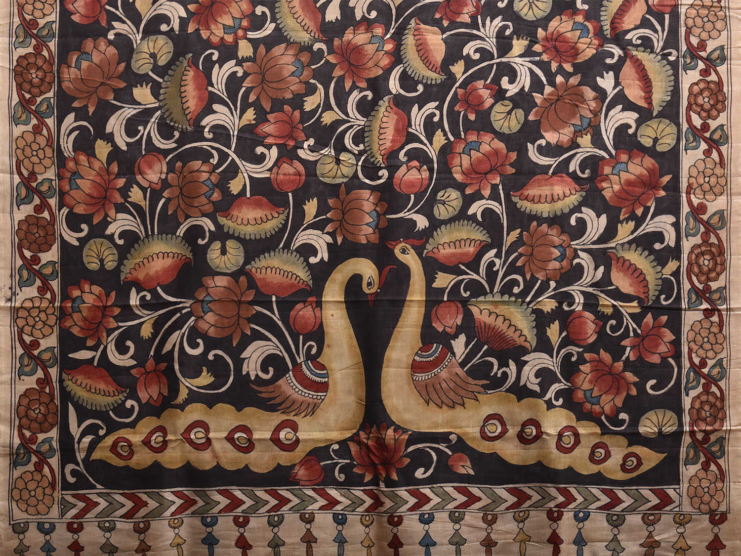 Cream and Black Kalamkari Hand Painted Silk Handloom Saree with Floral and Peacocks Pallu Design. This hand painted kalamkari is done using natural dyes. As they are natural colors they bleed with initial washes, so we suggest Dry clean.