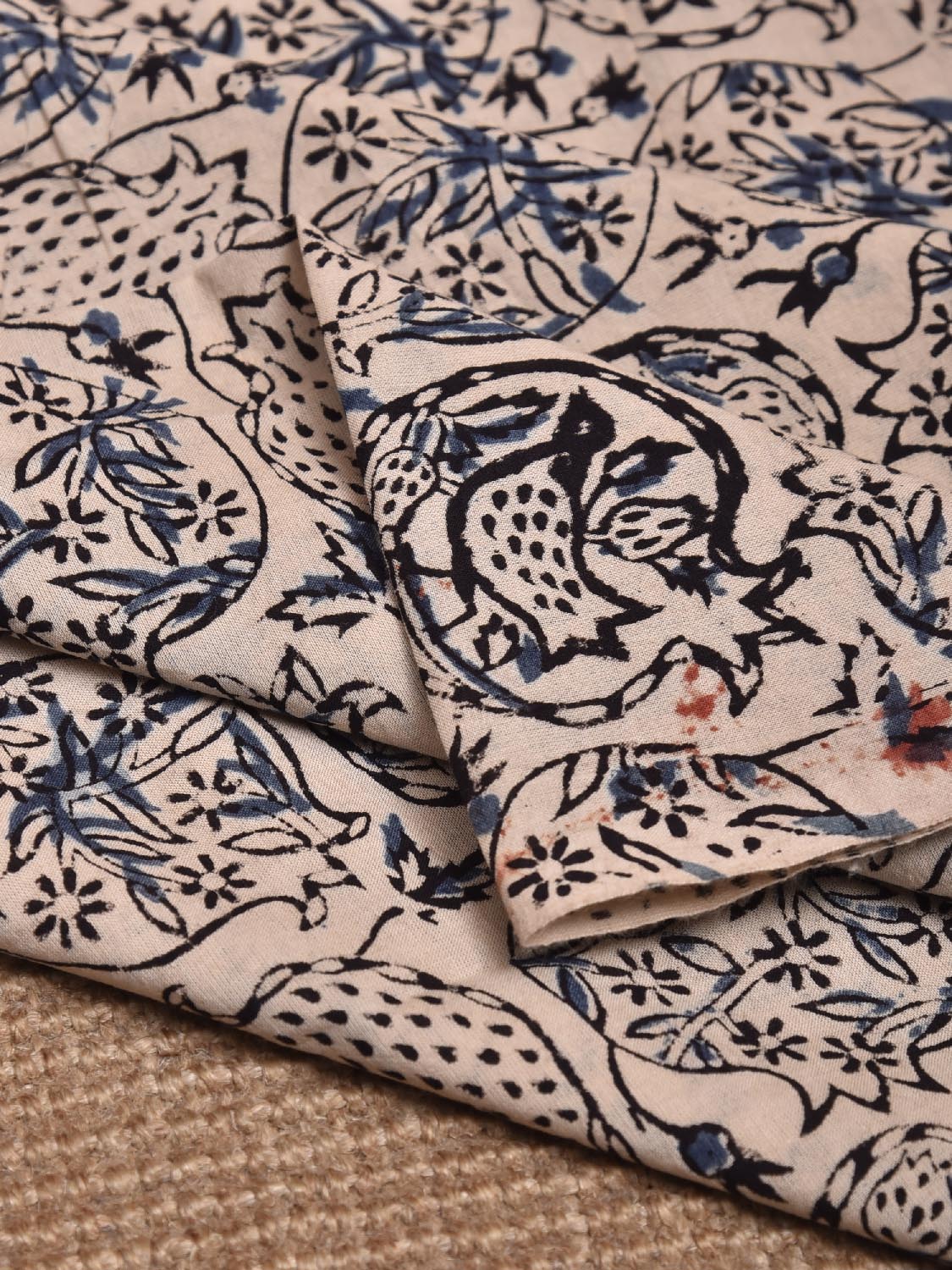 Cream and Blue Kalamkari Block Print Cotton Blouse with Floral Buta Design 1.2mt Length 35 Inches Width. Beautiful Pattern Blouse Fabric and Easy to Match to Any Suitable Saree. For fabric care we advise gentle handwash separately as they may bleed in the initial wash.