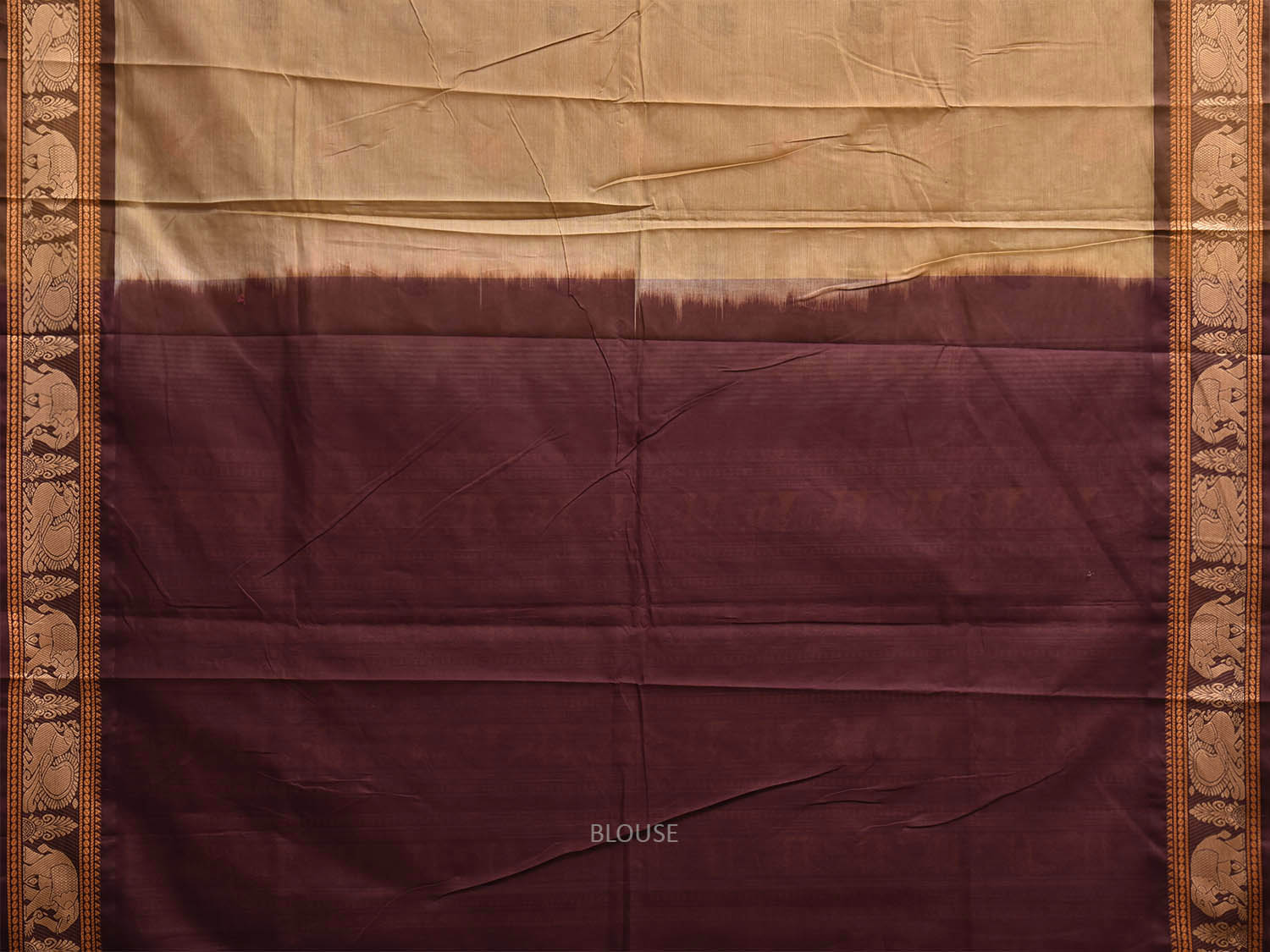 Cream and Brown Kanchipuram Cotton Saree with Checks and Pallu Design. Traditional Simple South Indian Attire Saree for any Casual Occasions. As it’s a cotton saree we advice gentle handwash separately for fabric care.