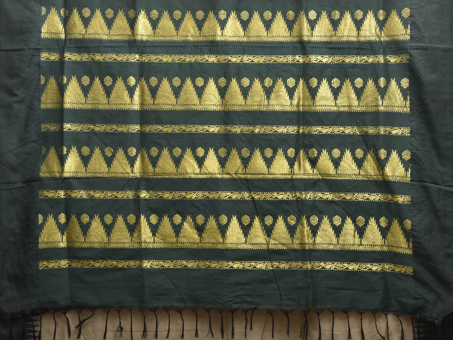 Cream and Green Gadwal Cotton Viscose Saree with Temple Border Design. Gadwal Sarees are known for their traditional design of border and pallu made of silk and body being either cotton or silk. They are known as Sico sarees for border and pallu being silk and body being cotton. We advice dry clean for fabric care.