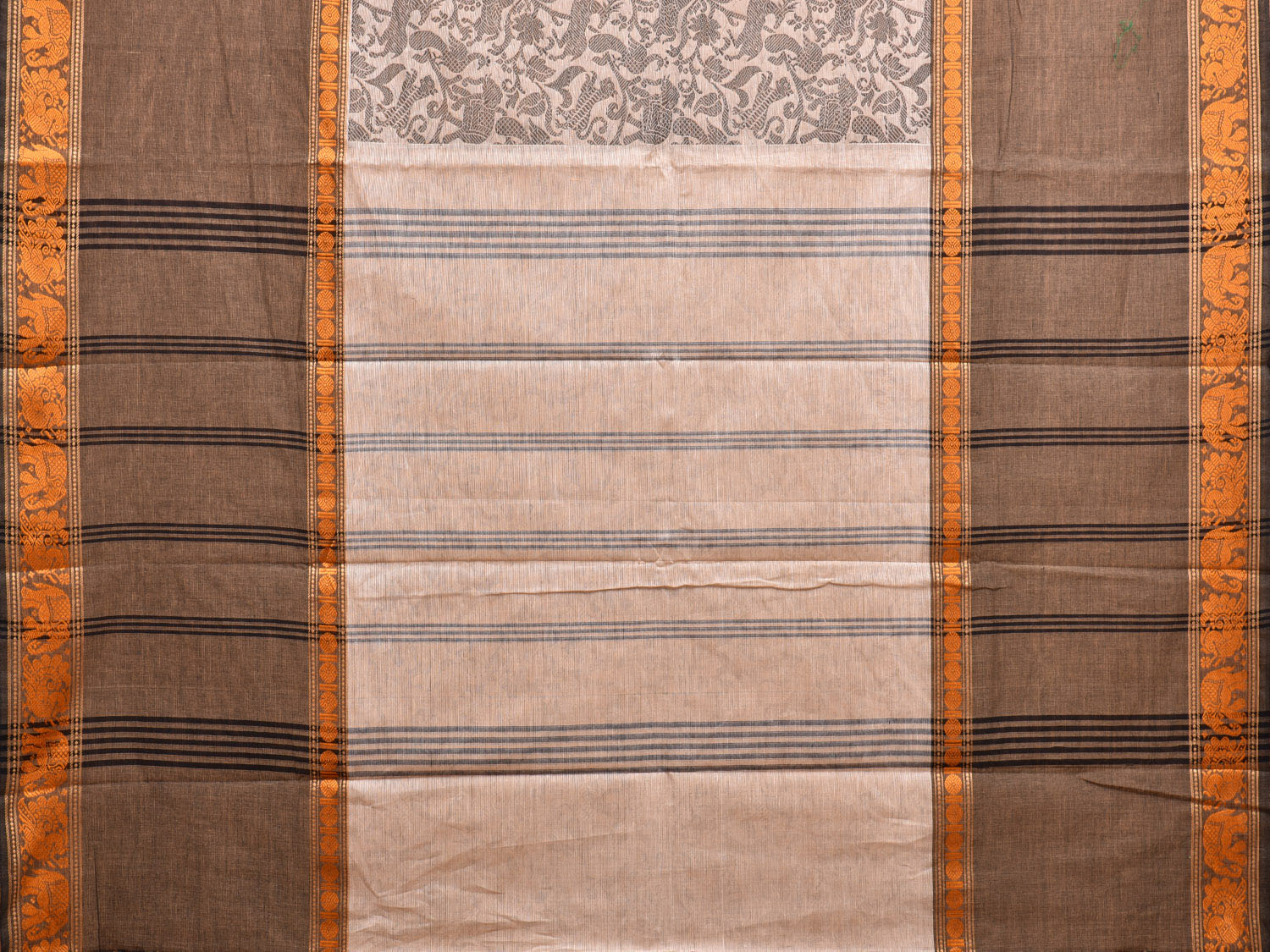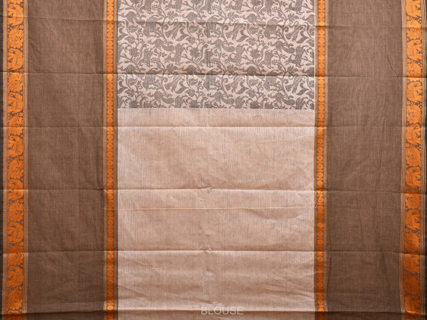Cream and Khaki Kanchipuram 60s Count Cotton Saree with All Over Shikargha Design k0630