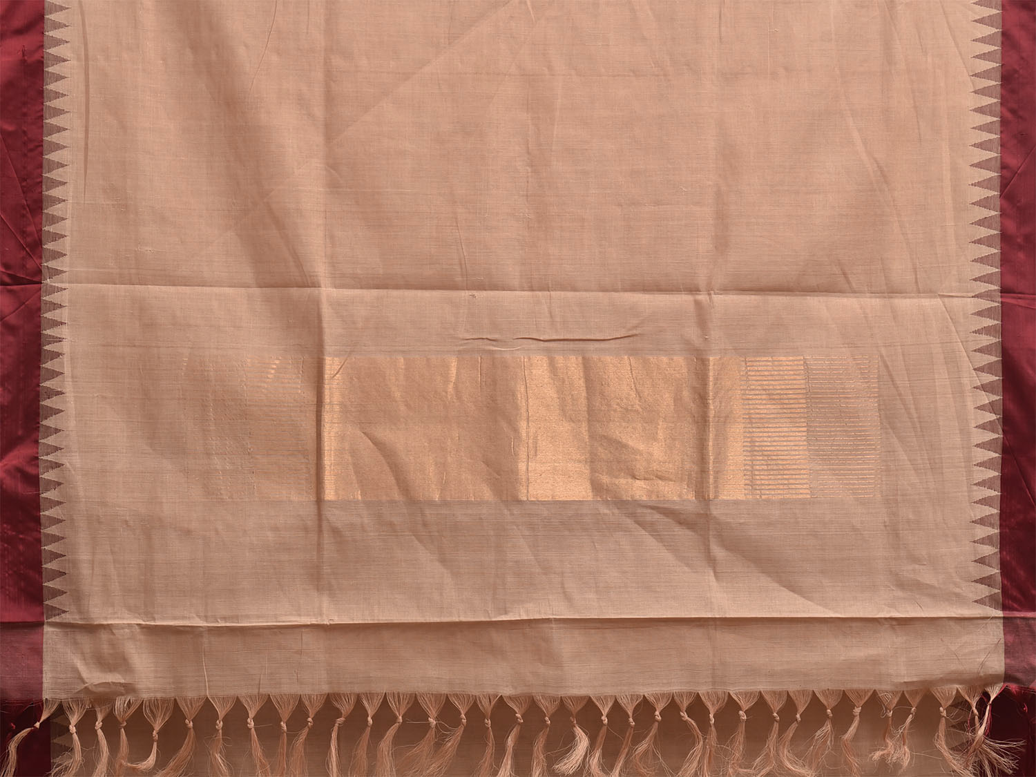 Cream and Maroon Khadi Cotton Handloom Palin Saree with Small Temple Border Design. Khadi saree is primarily woven from cotton and may also include silk, or wool. It is a versatile fabric, cool in summer and warm in winter. For fabric care we advise dry clean.