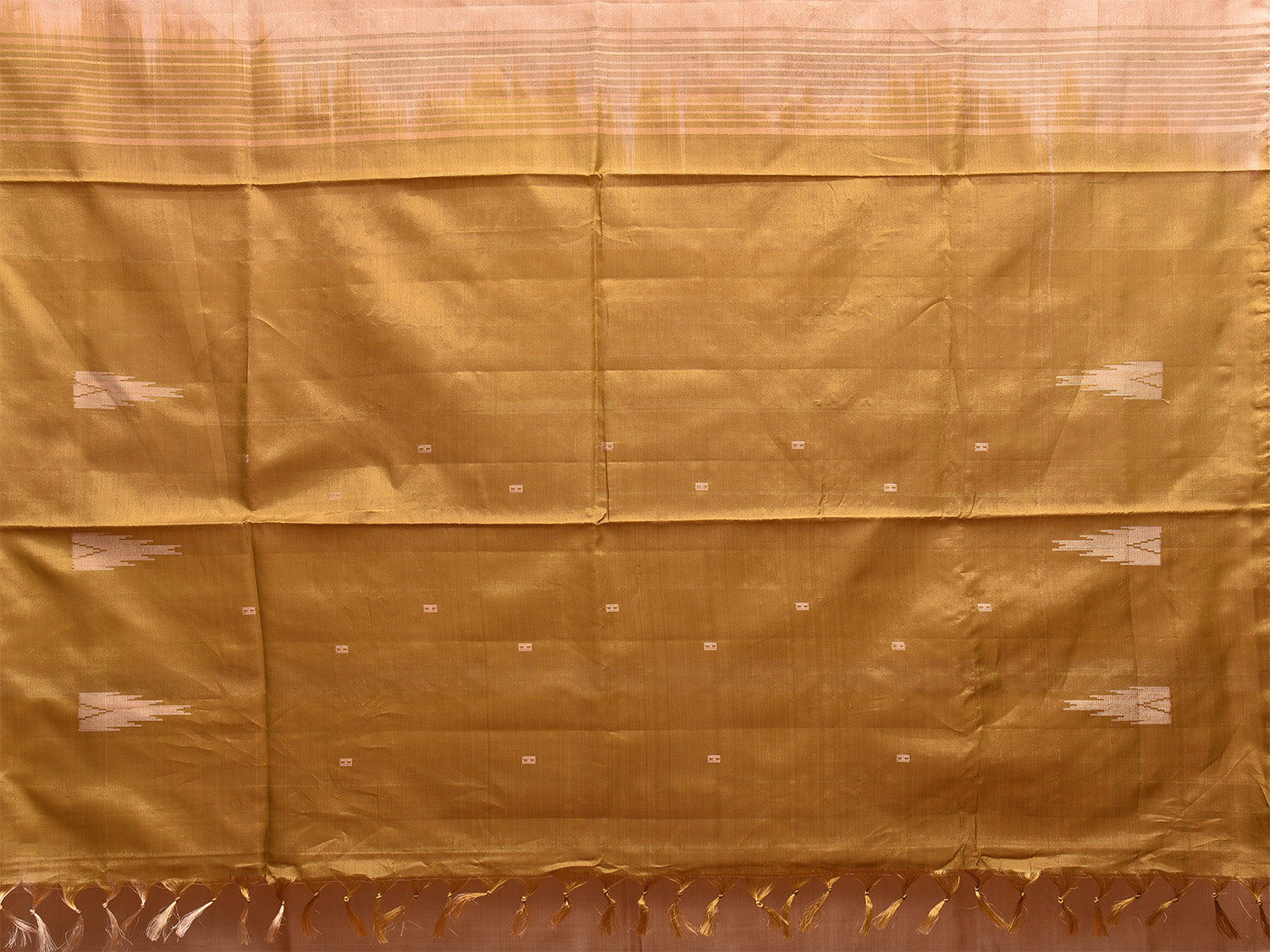 Cream and Olive Banana Silk Saree with Small Buta and Contrast Pallu Design No Blouse. Banana fibre sarees are organic and biodegradable, they are similar in quality to pure silk sarees. They give an exotic rich look and can be said a cruelty-free or ahimsa silk. . We advice dry clean for fabric care. This saree has no blouse.