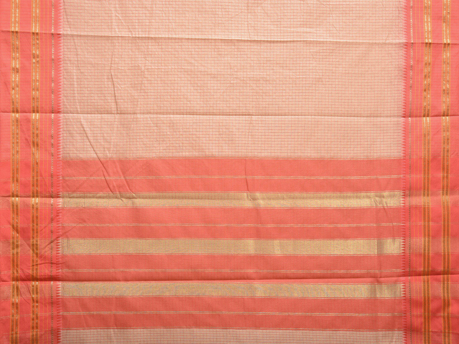 Cream and Peach Bamboo Cotton Viscose Silk Saree with Checks Design No Blouse. This is a blend of bamboo and cotton fibers, they have characteristics of both bamboo and cotton combined into one fabric. We Advise Gentle Handwash for Fabric Care. This Saree has no Blouse.