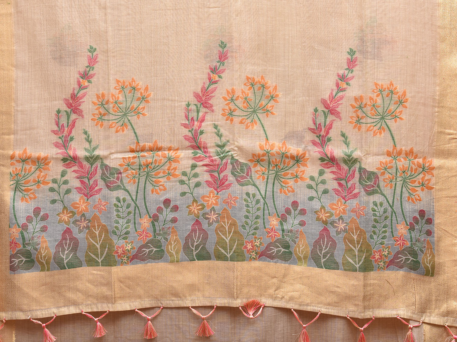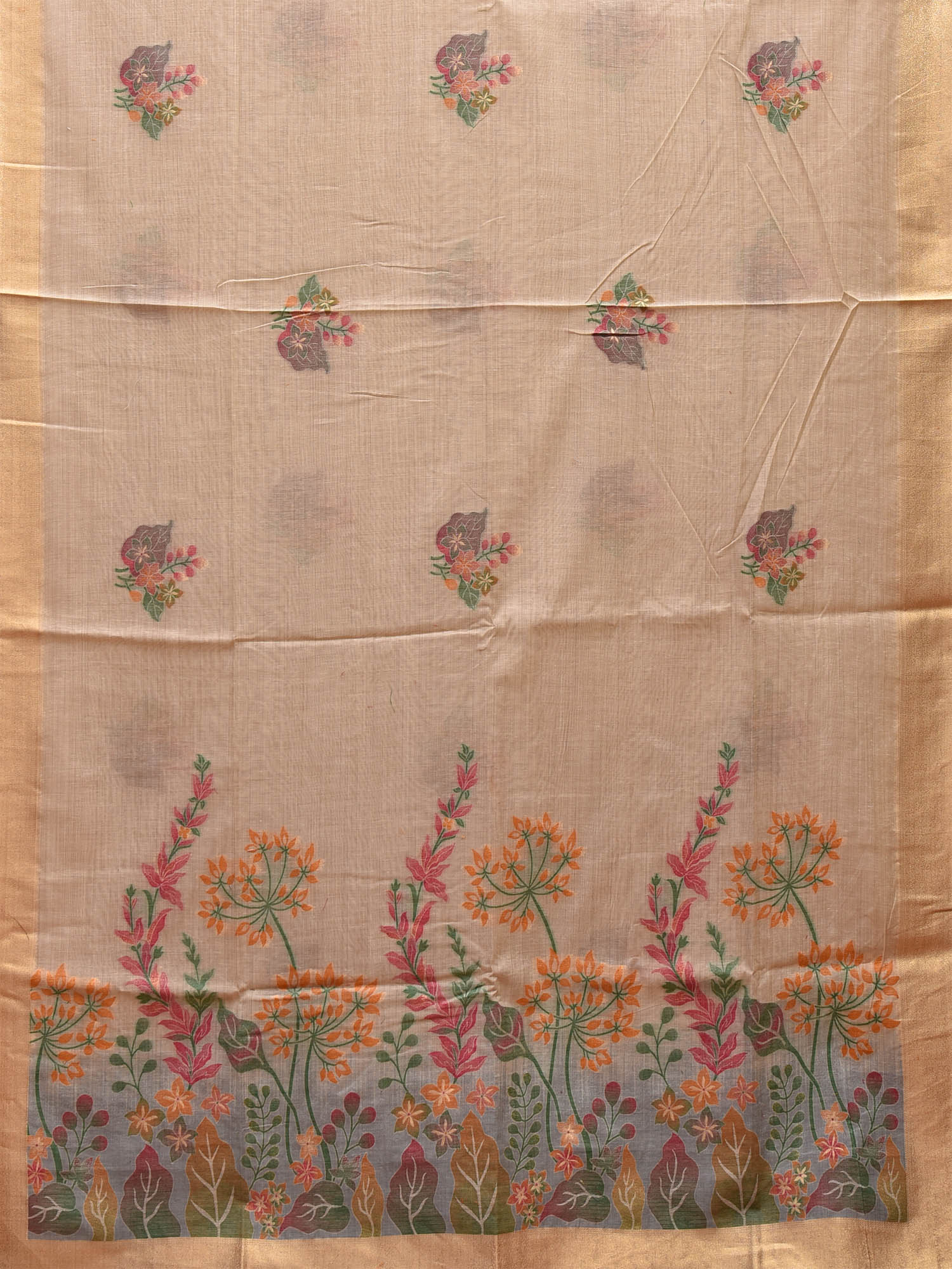 Cream Dhakai Jamdani Cotton Viscose Saree with Body Buta and Floral Pallu Design. These are some of the traditional Dhakai Jamdani designs, these sarees have geometric designs and sometimes floral or combination of both. We advice dry clean for fabric care.