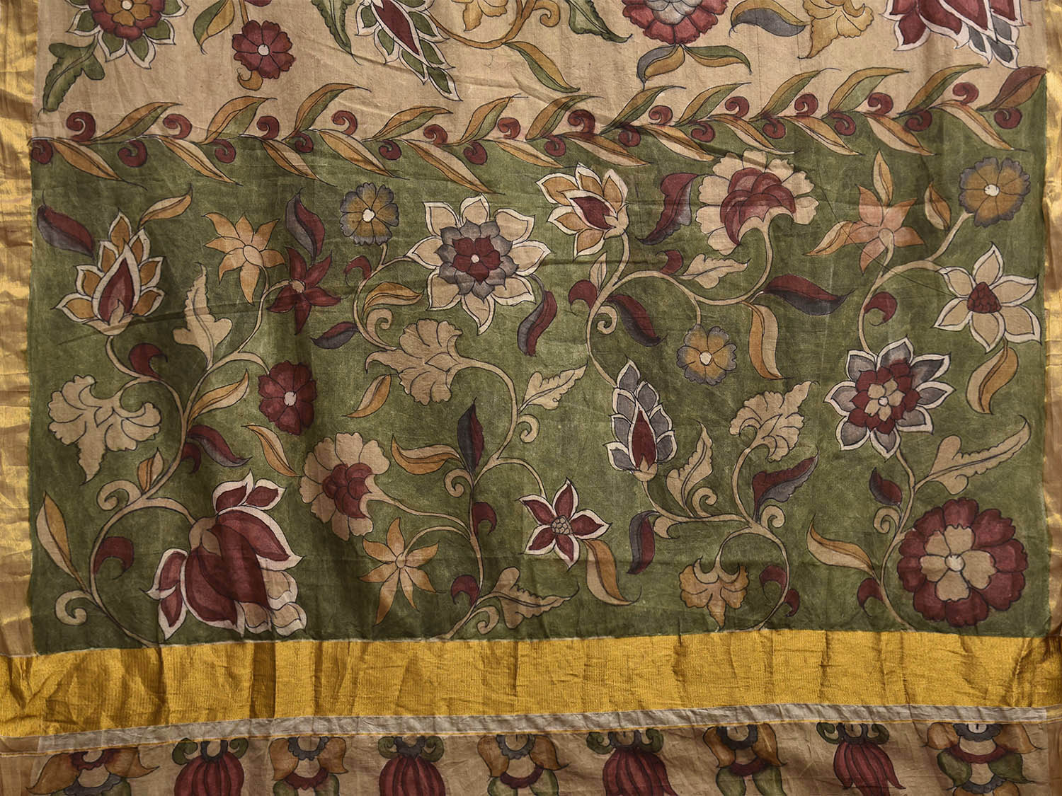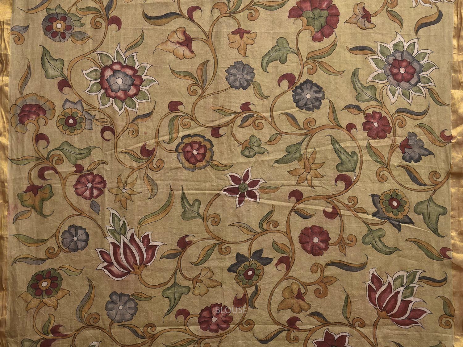 Cream Kalamkari Hand Painted Cotton Handloom Saree with Lotus Flowers Design KL0833