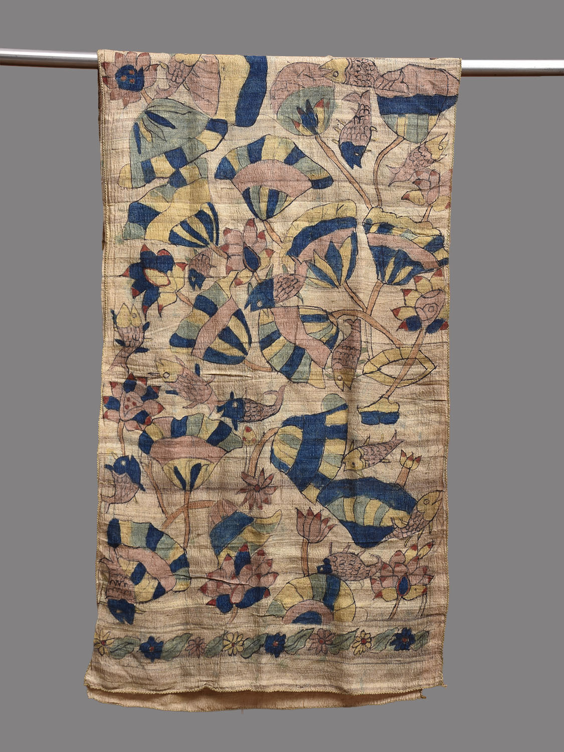 Cream Kalamkari Hand Painted Tussar Stole with Floral and Fishes Design. This hand painted kalamkari is done using natural dyes. As they are natural colors they bleed with initial washes, so we suggest Dry clean.