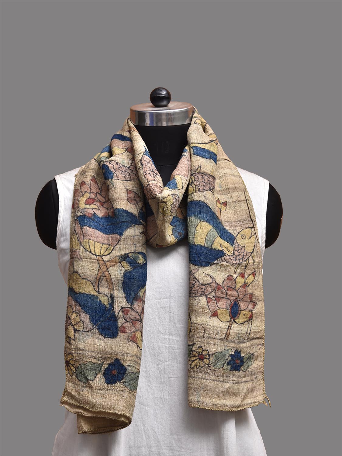 Cream Kalamkari Hand Painted Tussar Stole with Floral and Fishes Design ds3787