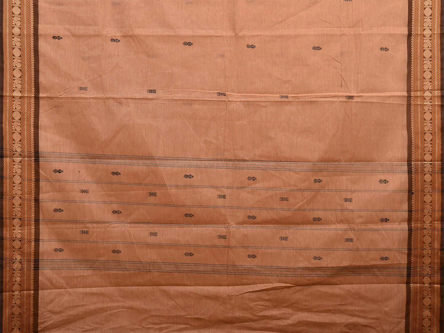 Cream Kanchipuram 80s Cotton Plain Saree with Buta and Peacock-Rudraksh Border Design No Blouse. Traditional Simple South Indian Attire Saree for any Casual Occasions. As it’s a cotton saree we advice gentle handwash separately for fabric care. This saree has no blouse.