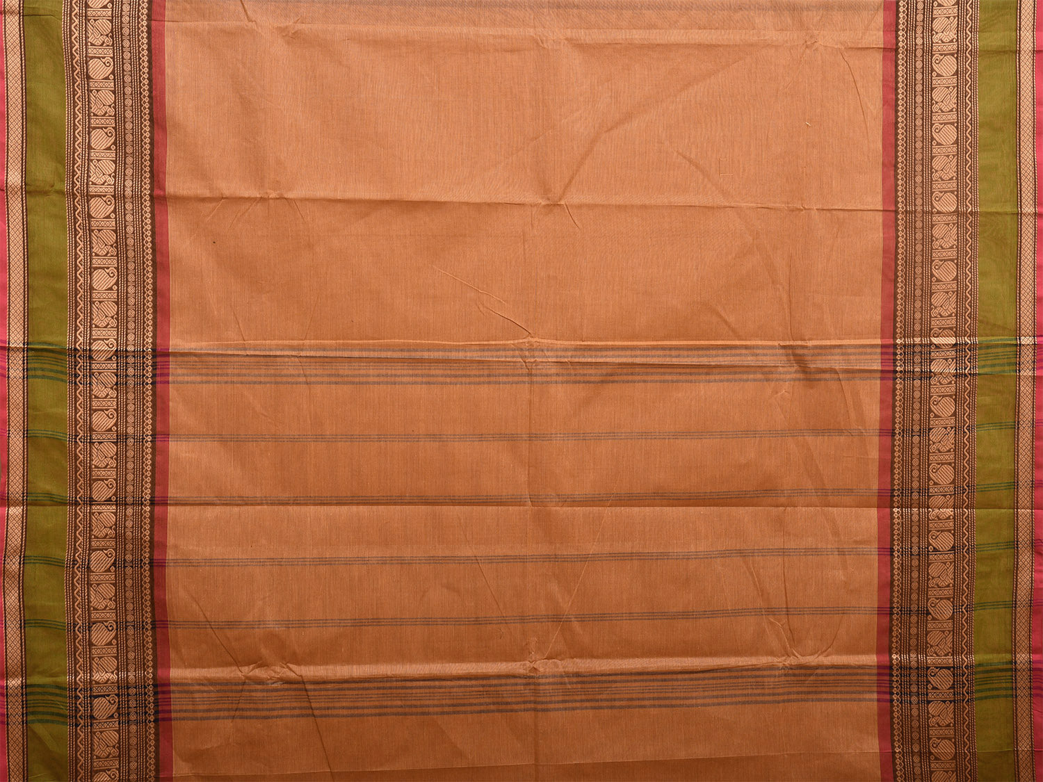 Cream Kanchipuram 80s Cotton Plain Saree with Peacock-Mango Border Design No Blouse. Traditional Simple South Indian Attire Saree for any Casual Occasions. As it’s a cotton saree we advice gentle handwash separately for fabric care. This saree has no blouse.