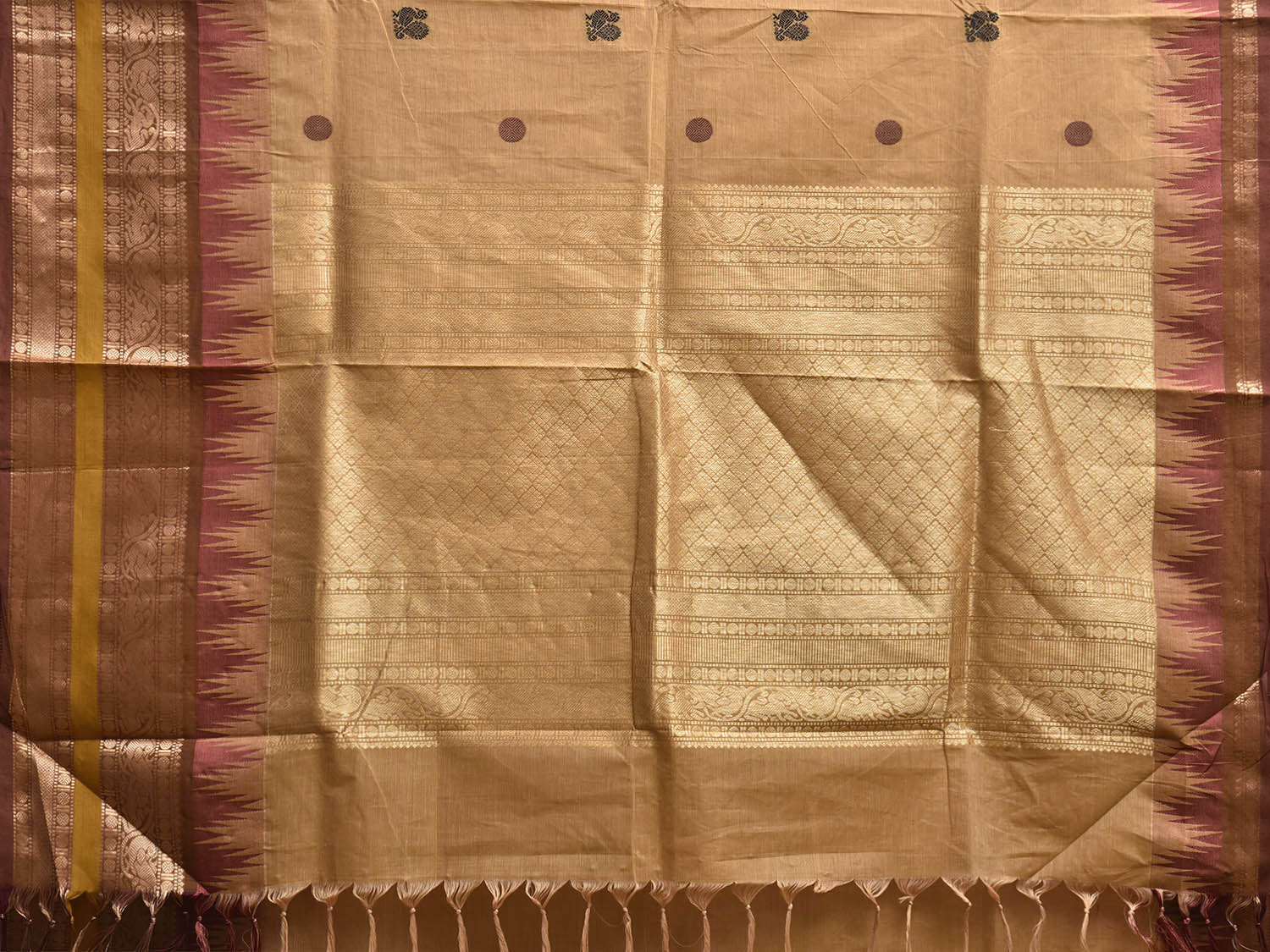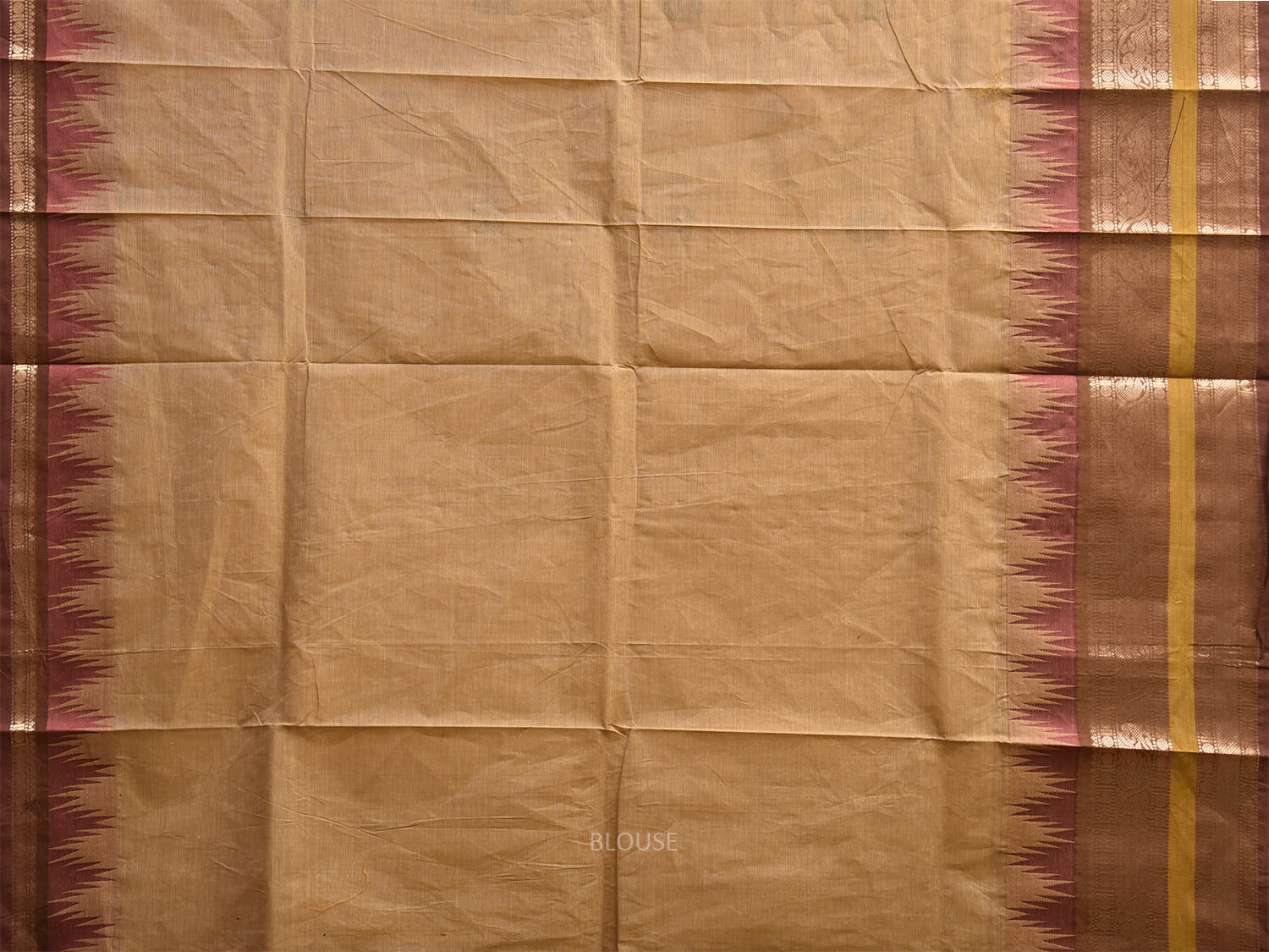 Cream Kanchipuram Cotton Saree with Big Temple Border and Pallu Design. Traditional Simple South Indian Attire Saree for any Casual Occasions. As it’s a cotton saree we advice gentle handwash separately for fabric care.