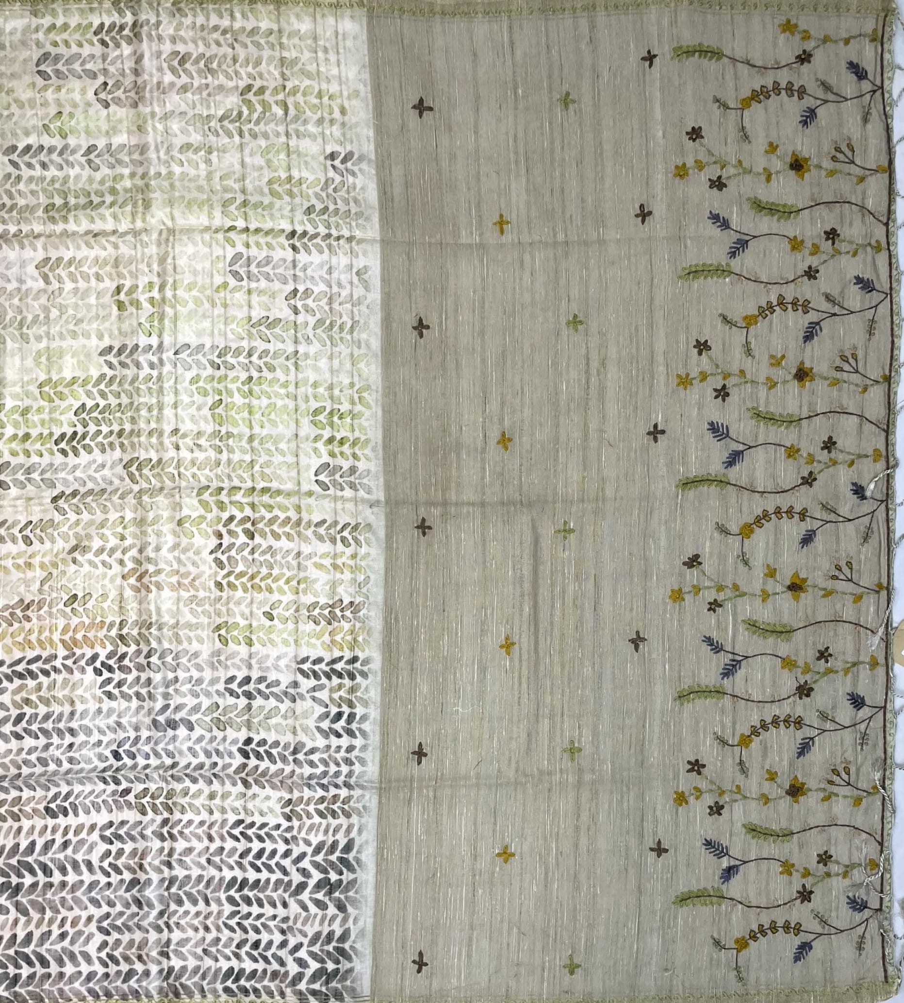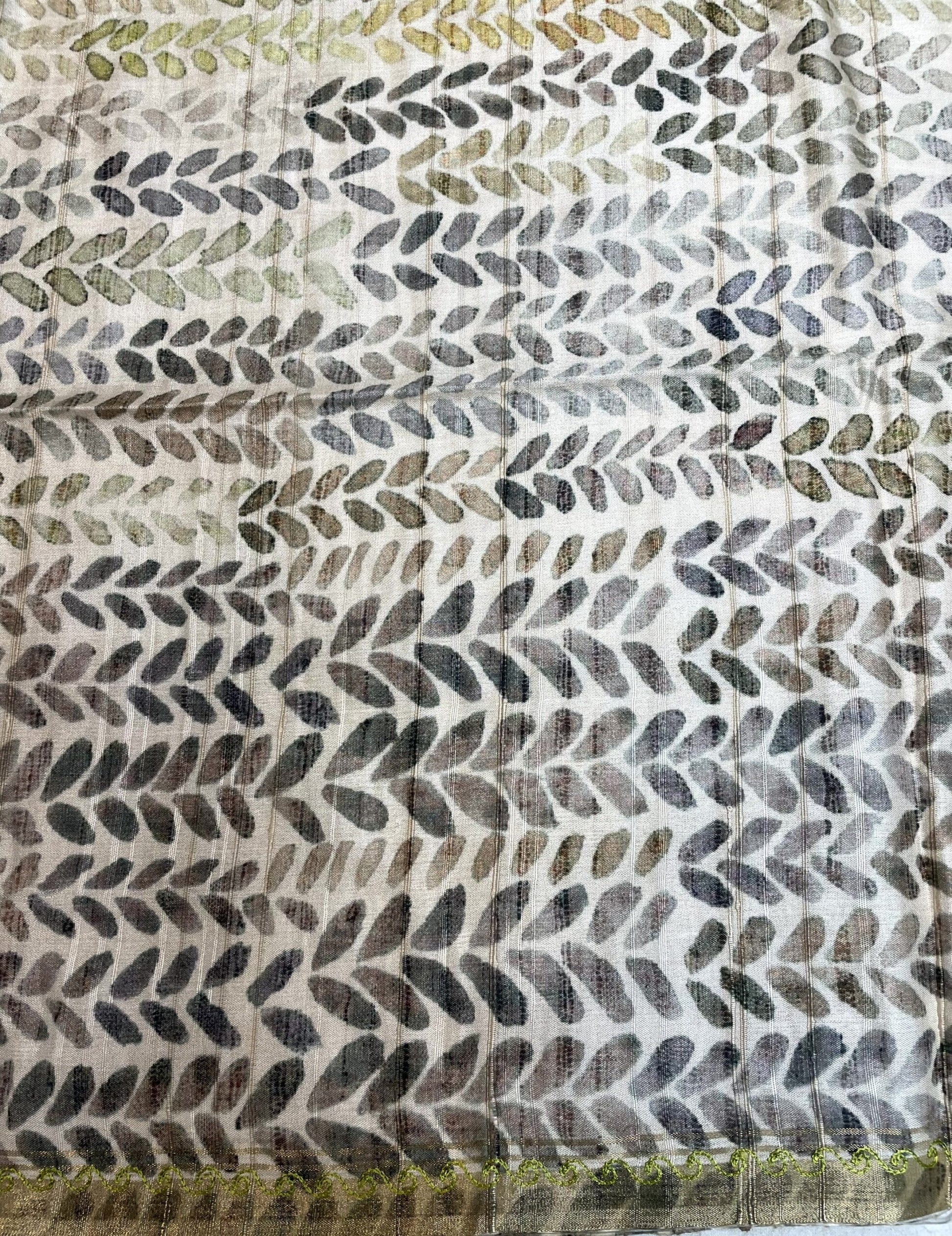 Cream Viscose Silk with Thread Work Pallu and Leaf Floral Digital Print