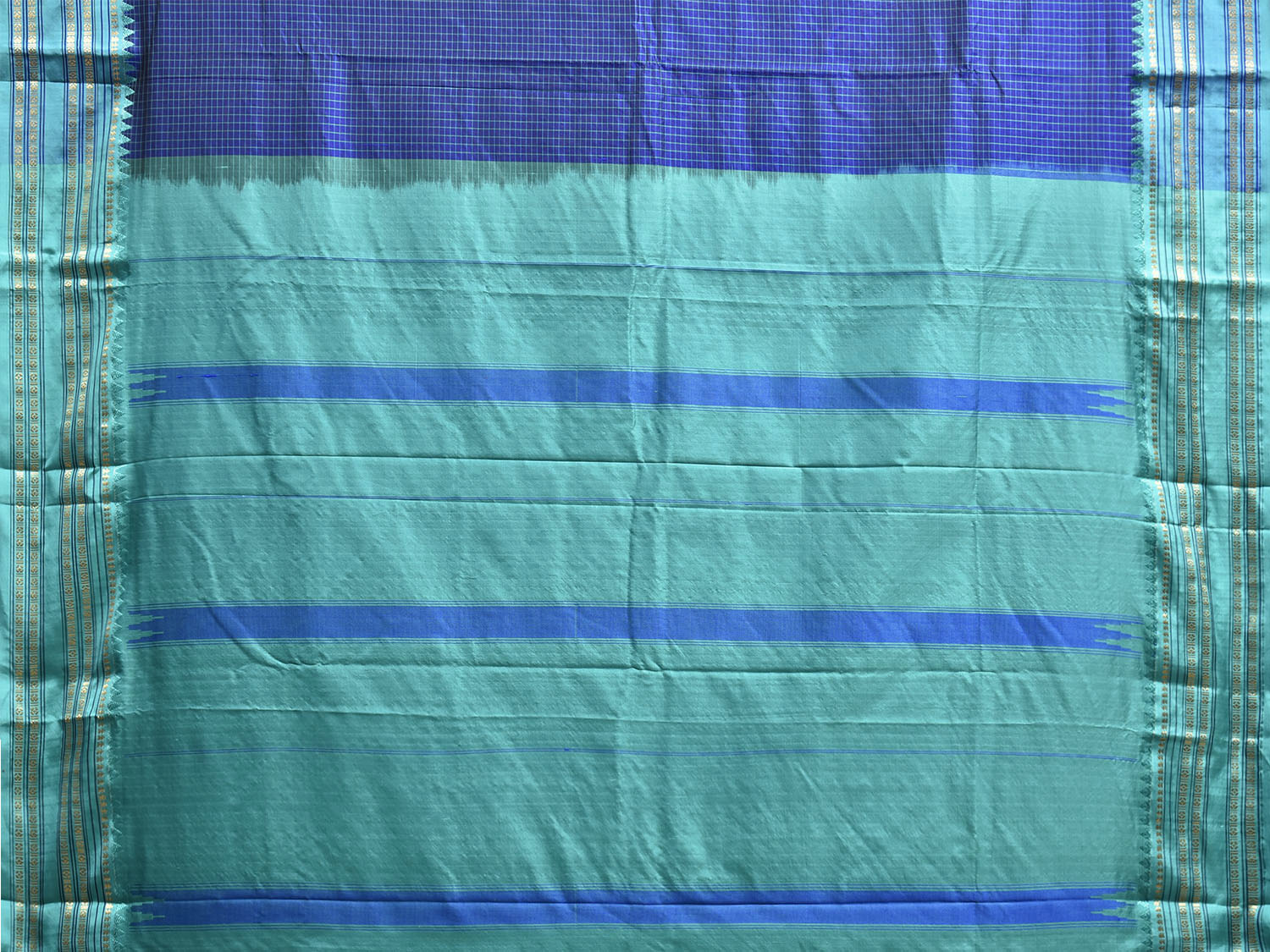 Dark Blue and Turquoise Narayanpet Silk Saree with Checks and Contrast Pallu Design. These are Traditional Narayanpet Design Sarees. For fabric care we advise dry clean.