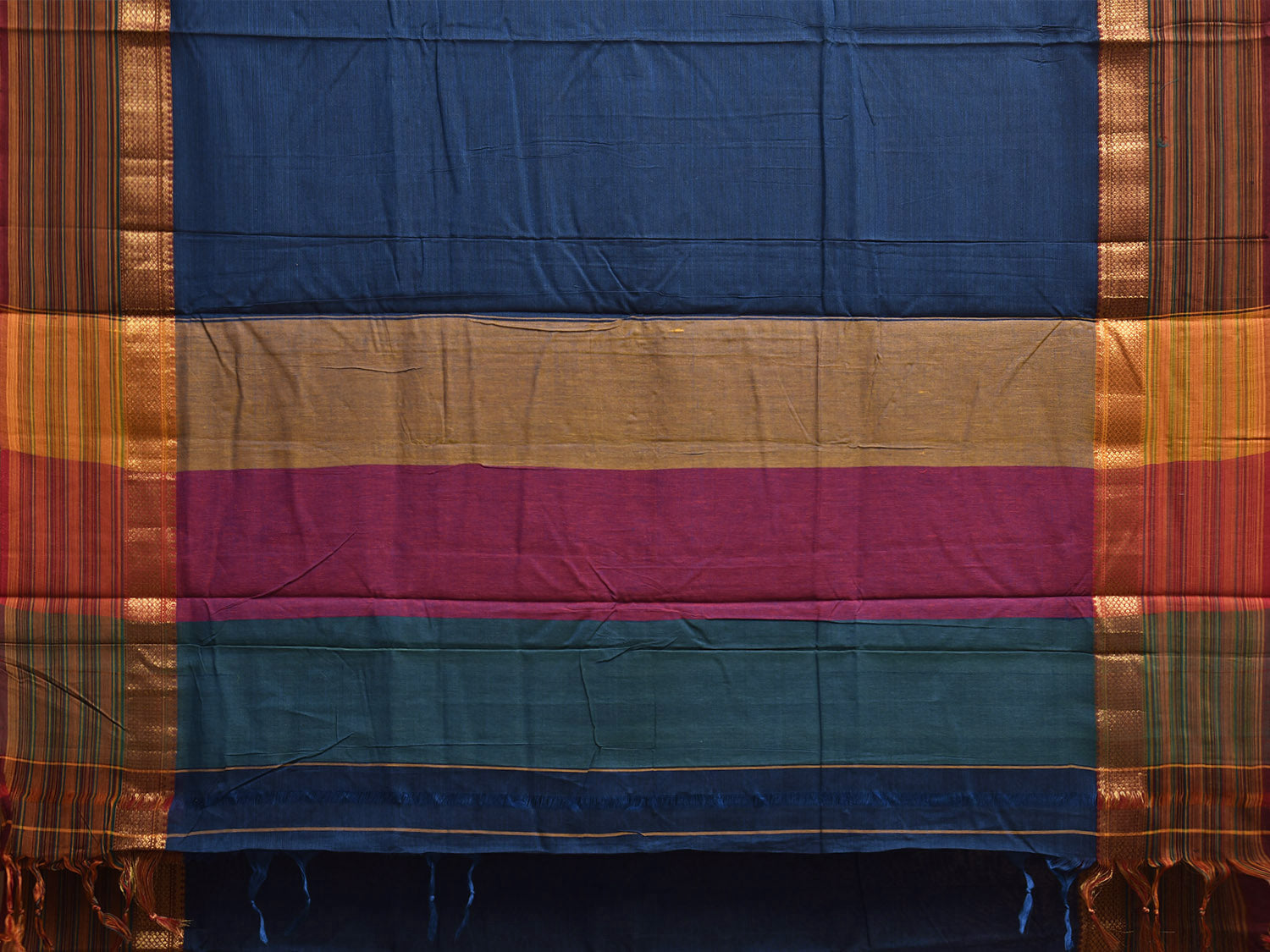 Dark Blue Kanchipuram Cotton Plain Saree with Strips Pallu and Border Design No Blouse k0878