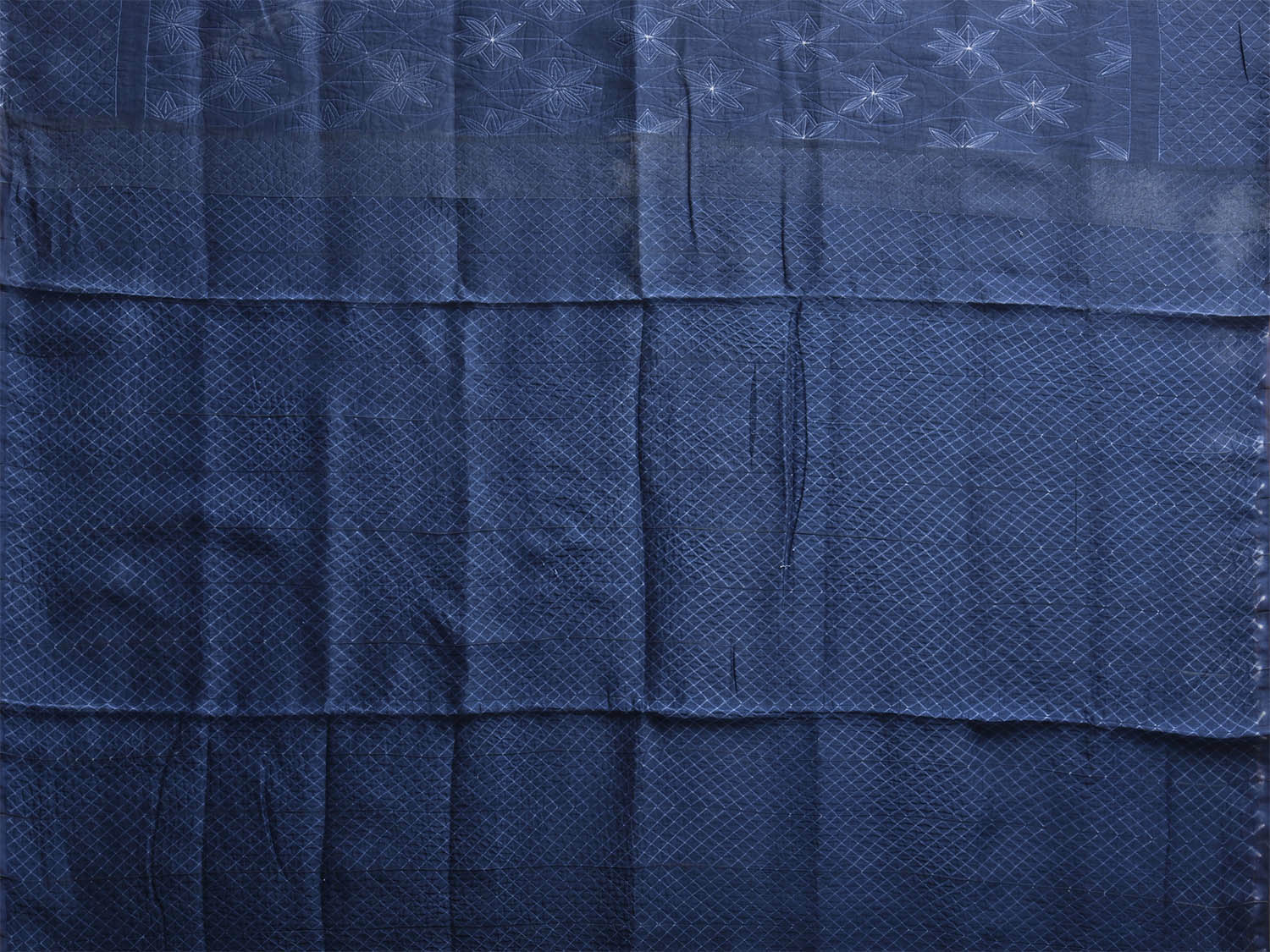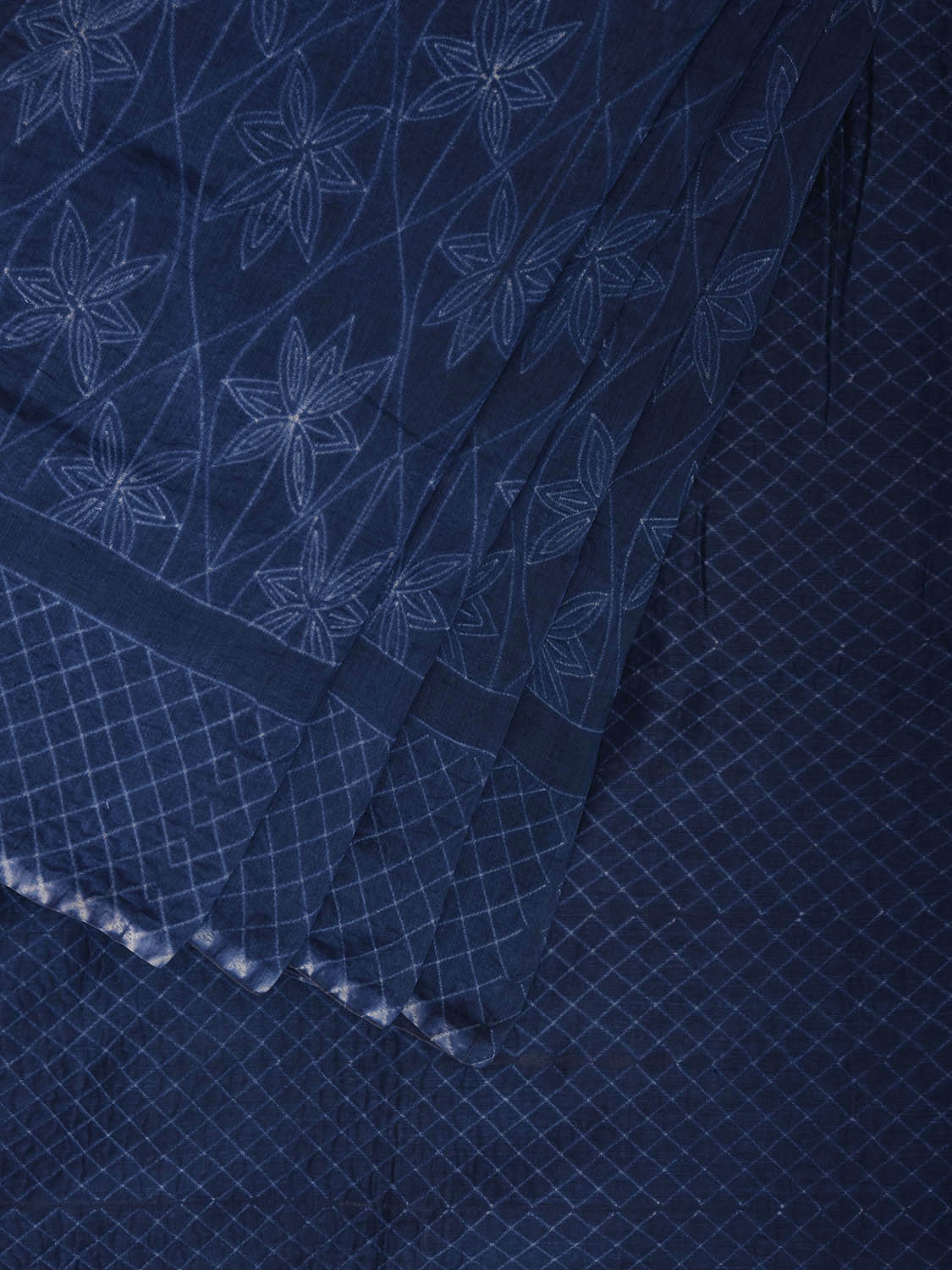 Dark Blue Shibori Cotton Silk Saree with Grill Border and Floral Design. We advice dry clean for fabric care.