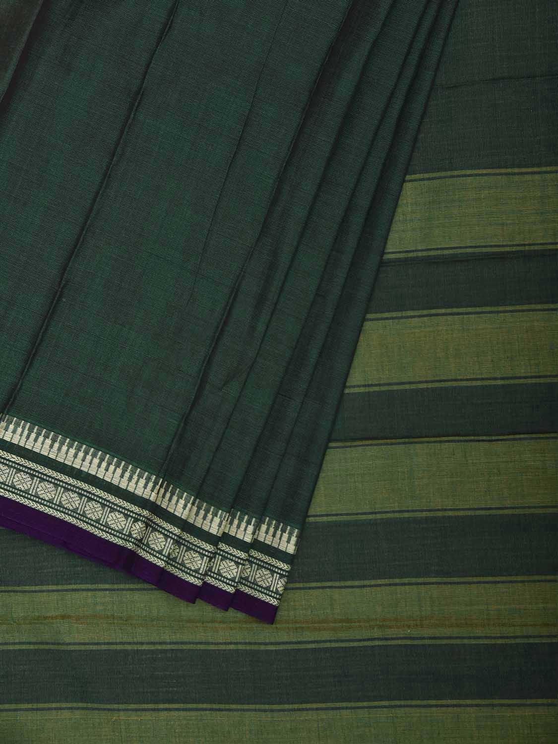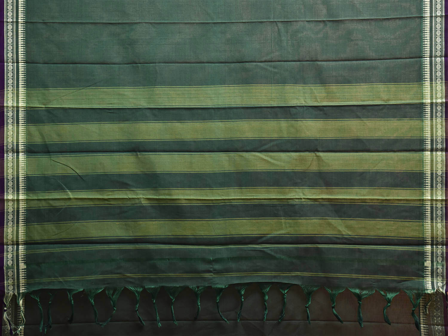 Dark Green and White Narayanpet Cotton Plain Saree with Strips Pallu Design No Blouse. This saree has no blouse.