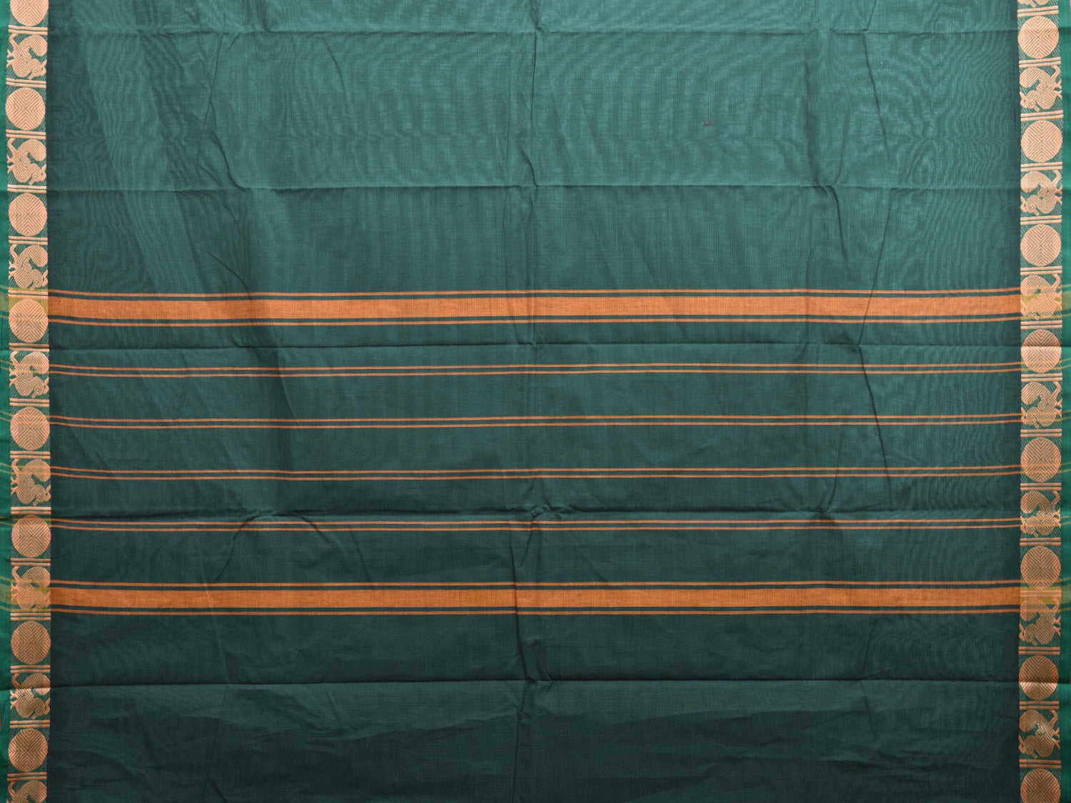 Dark Green Kanchipuram Cotton Plain Saree with Border and Strips Pallu Design No Blouse. 80s count of compact combed cotton yarn is used in warp and weft for greater finish and long lasting. Traditional Simple South Indian Attire Saree for any Casual Occasions, it has 80s count of cotton yarn. As it’s a cotton saree we advise gentle hand wash separately for fabric care. This saree has no blouse.