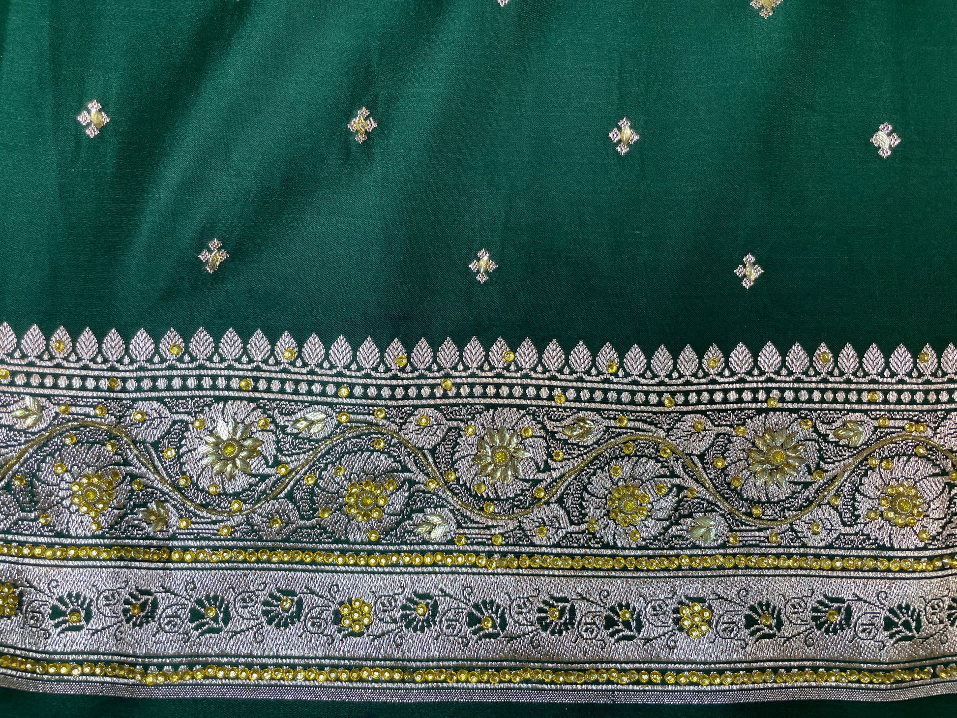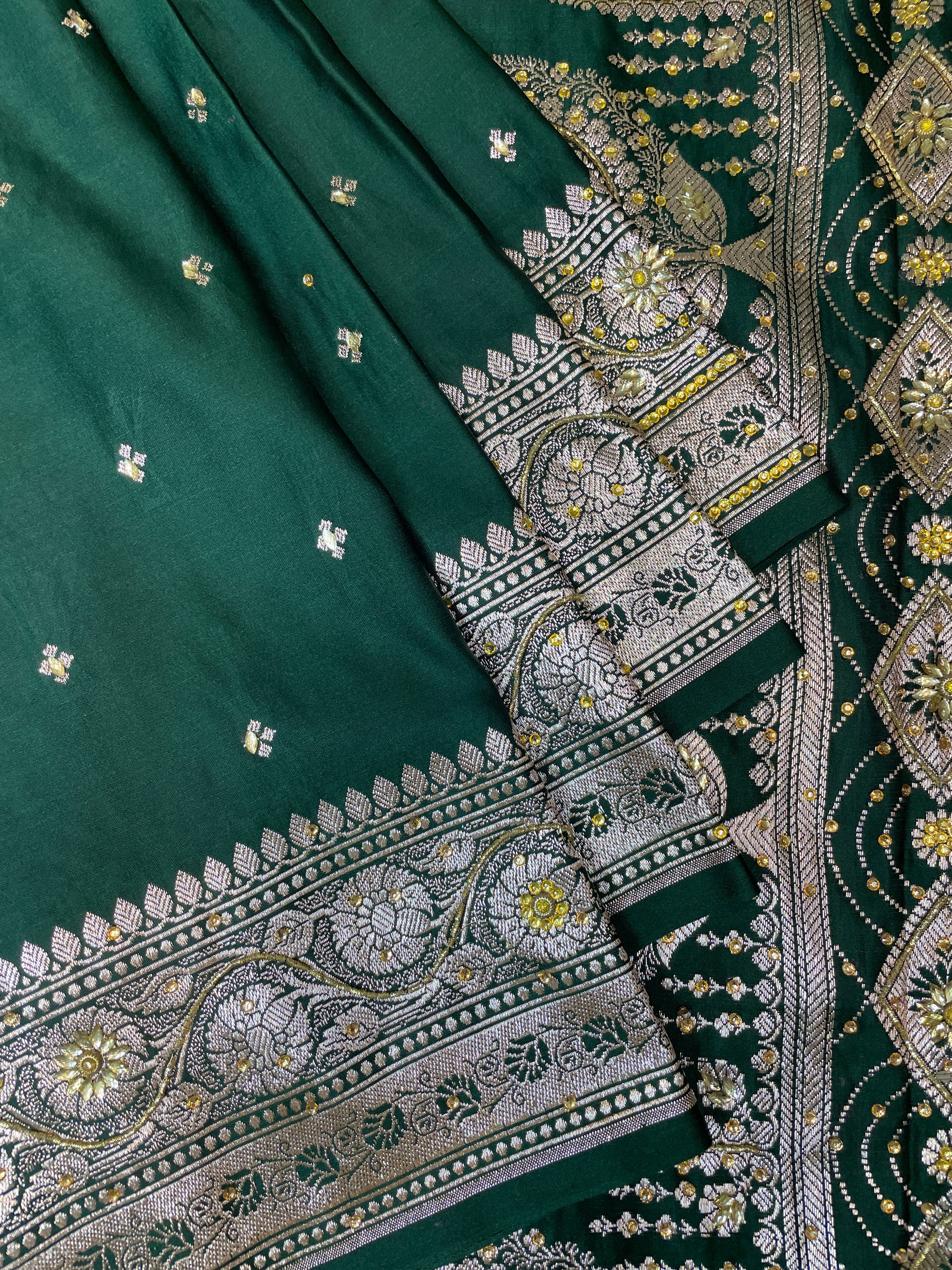 Drape yourself in timeless elegance with this exquisite emerald green Banarasi silk saree, adorned with delicate silver zari motifs throughout the body. The saree features an intricately woven floral and paisley border, complemented by a regal pallu with detailed brocade craftsmanship that reflects the rich heritage of Banaras.Perfect for weddings, festive occasions, and grand celebrations, this saree brings together tradition and luxury in every drape. The lustrous silk fabric adds a graceful fall and sheen, while the silver zari creates a stunning contrast that enhances its royal charm.