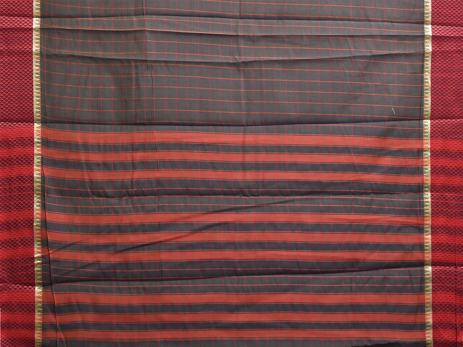 Dark Grey and Red Bamboo Cotton Saree with Big Checks Design No Blouse bc0984
