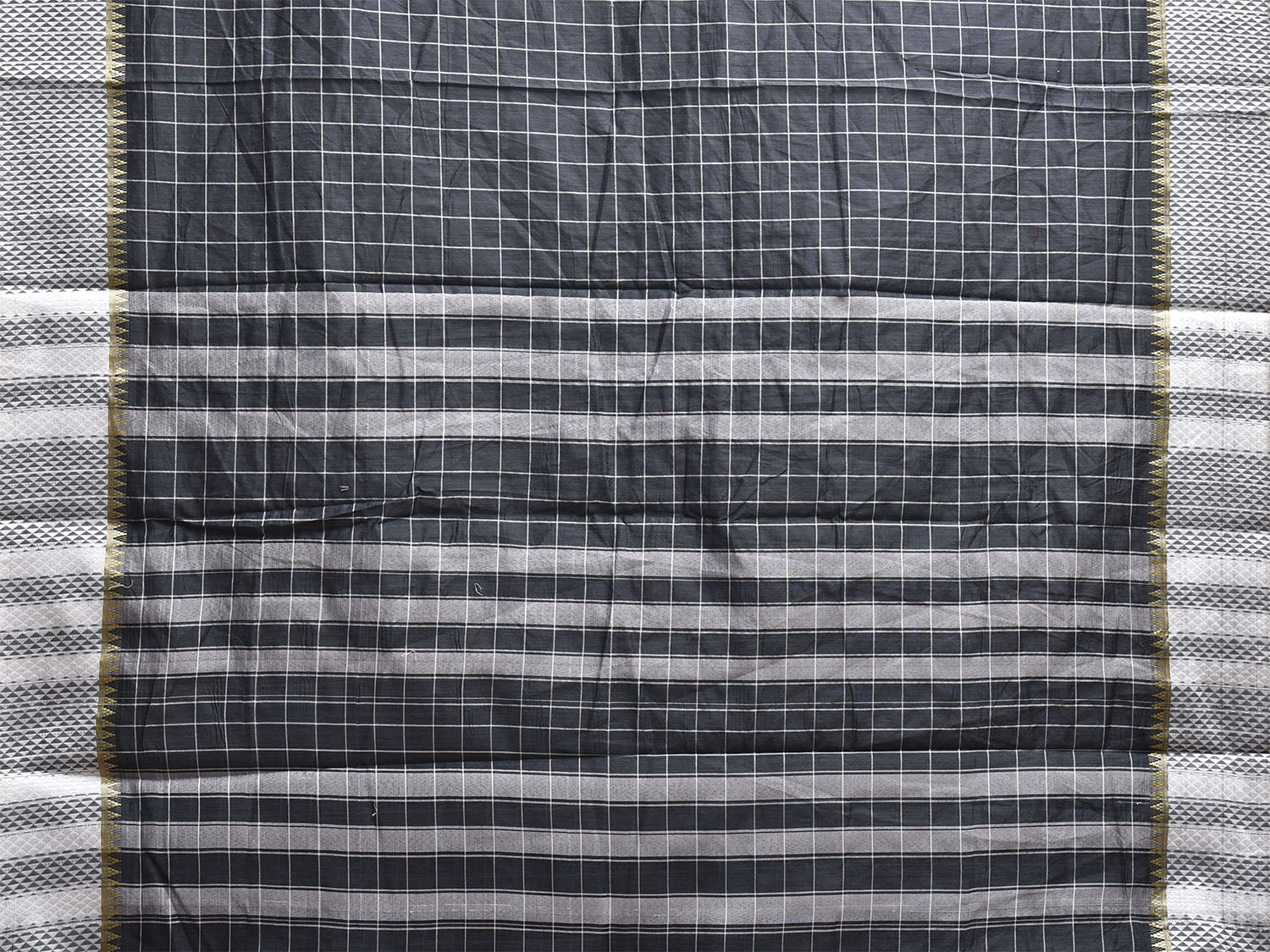 Dark Grey and White Bamboo Cotton Saree with Big Checks Design No Blouse. This is a blend of bamboo and cotton fibers, they have characteristics of both bamboo and cotton combined into one fabric. We Advise Gentle Handwash for Fabric Care. This Saree has no Blouse.