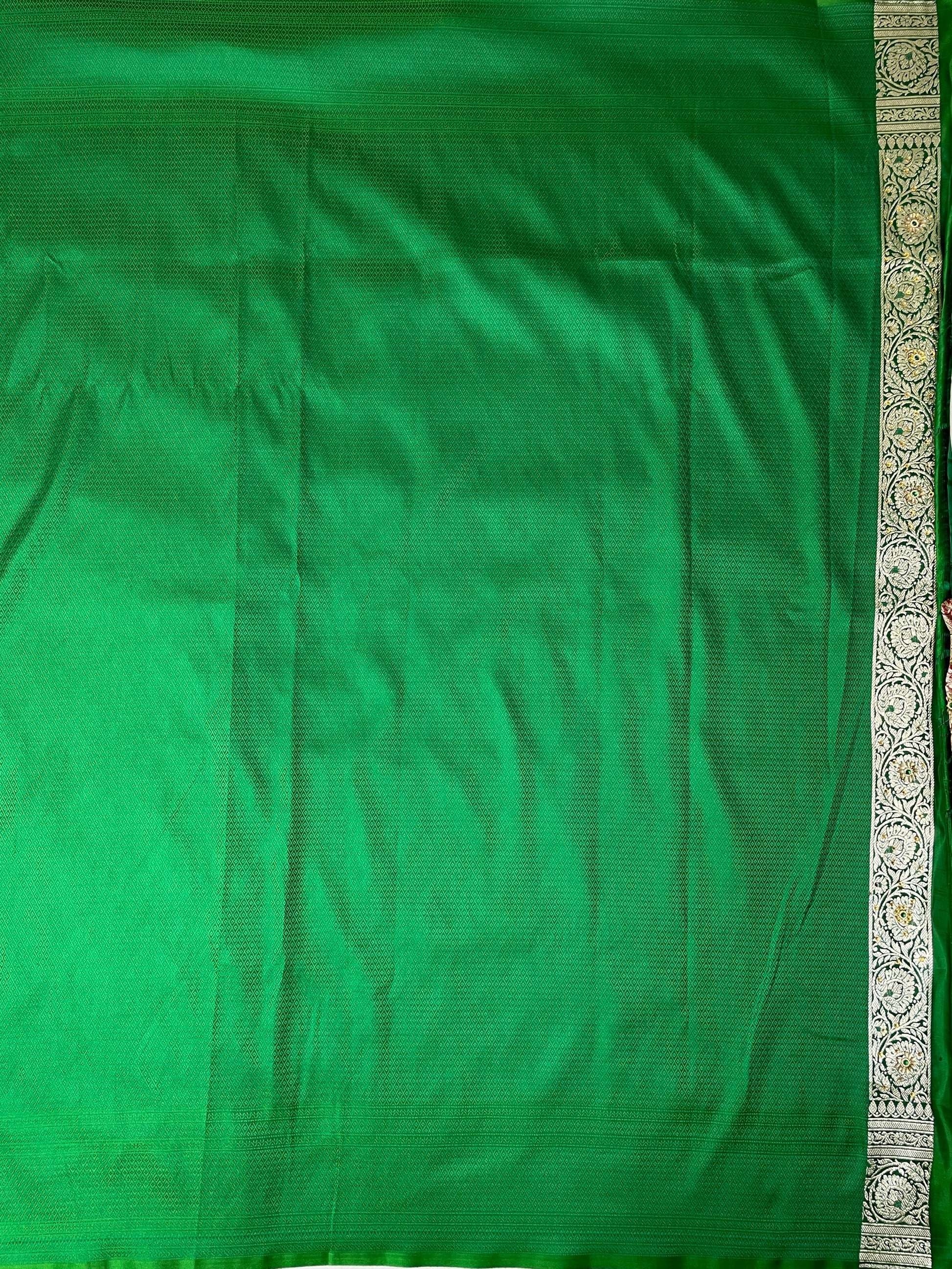 Drape yourself in timeless elegance with this exquisite emerald green Banarasi silk saree, adorned with delicate silver zari motifs throughout the body. The saree features an intricately woven floral and paisley border, complemented by a regal pallu with detailed brocade craftsmanship that reflects the rich heritage of Banaras.Perfect for weddings, festive occasions, and grand celebrations, this saree brings together tradition and luxury in every drape. The lustrous silk fabric adds a graceful fall and sheen, while the silver zari creates a stunning contrast that enhances its royal charm.