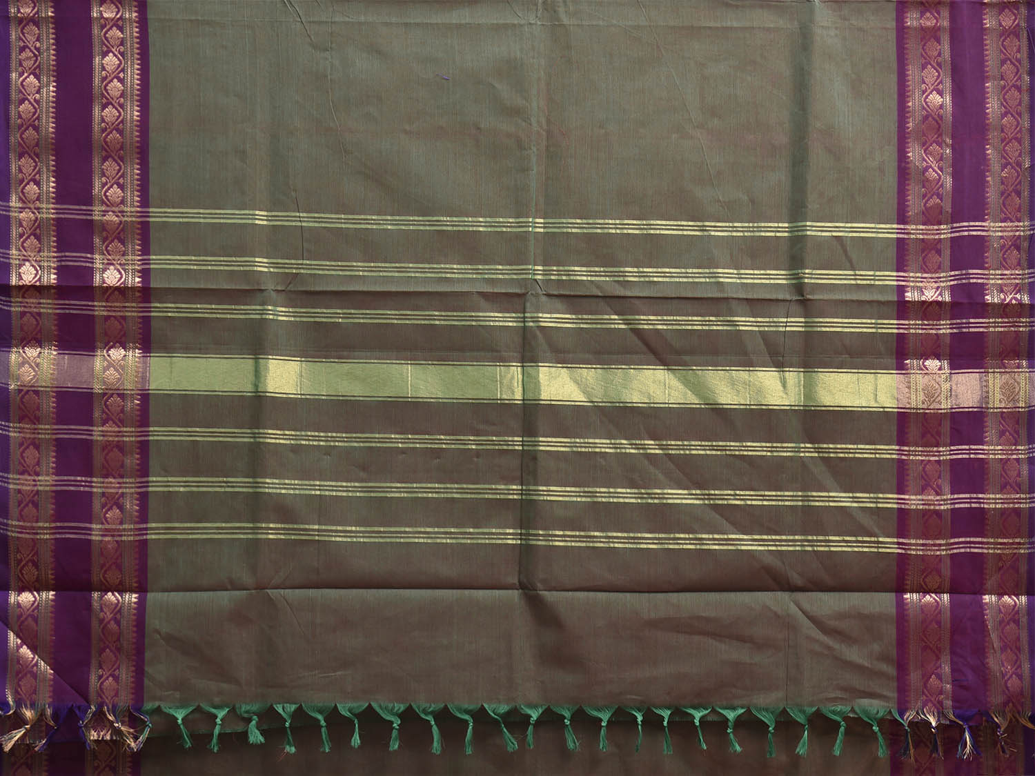 Dark Olive and Purple Kanchipuram Cotton Plain Saree with Strips Pallu and Border Design No Blouse k1027