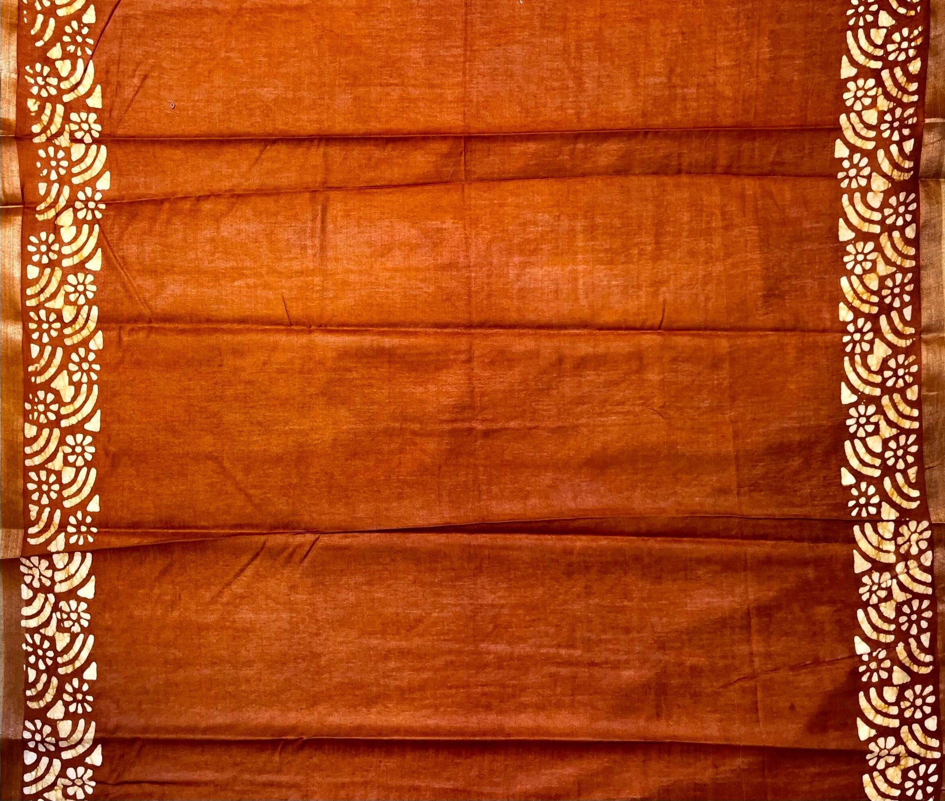 Dark Orange Batik Printed Zari Border with Body and Pallu Design