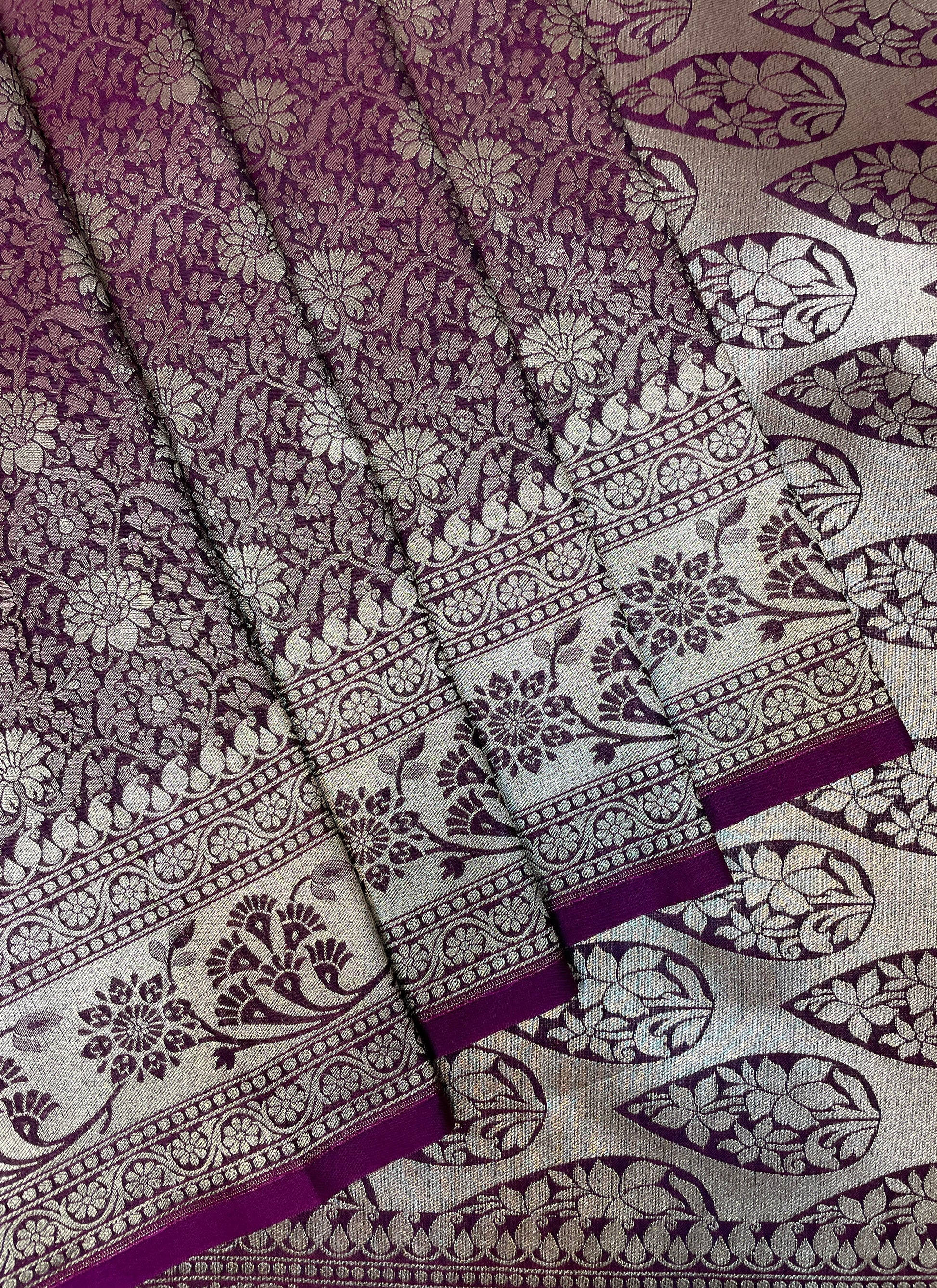 Dark Purple Katan Banarasi Saree with Silver Zari Floral Weaving And Grand Pallu B0604ds