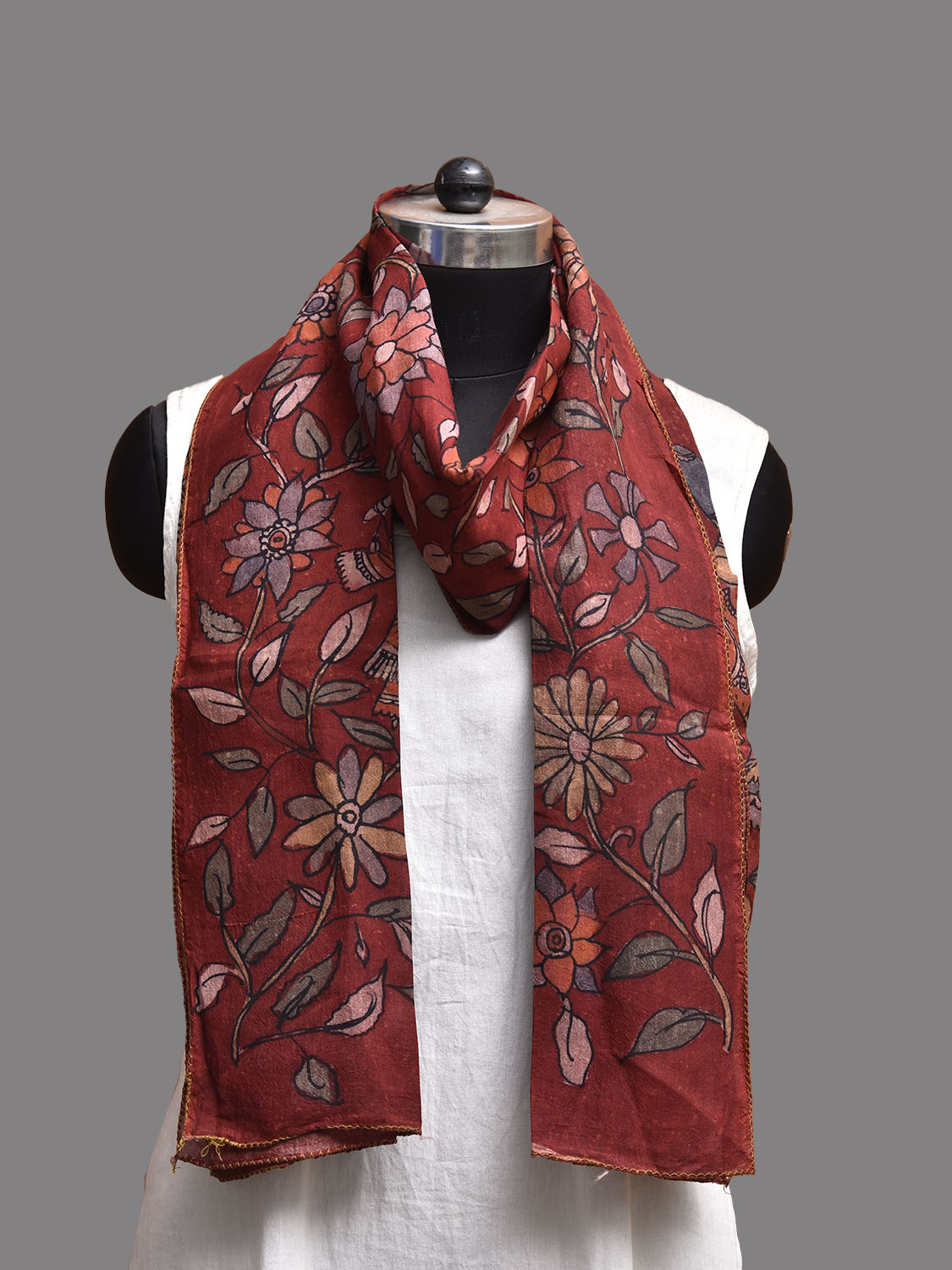 Dark Red Kalamkari Hand Painted Sico Stole with Floral and Krishna Design ds3779