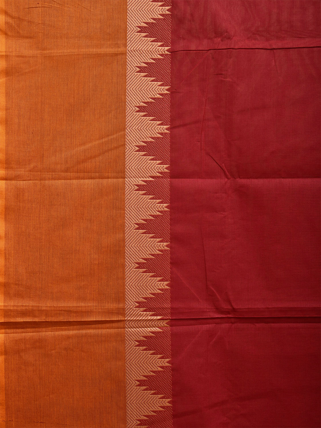 Dark Red Kanchipuram 80s Cotton Plain Saree with Ganga-Jamuna Temple Border Design No Blouse. Traditional Simple South Indian Attire Saree for any Casual Occasions. As it’s a cotton saree we advice gentle handwash separately for fabric care. This saree has no blouse.