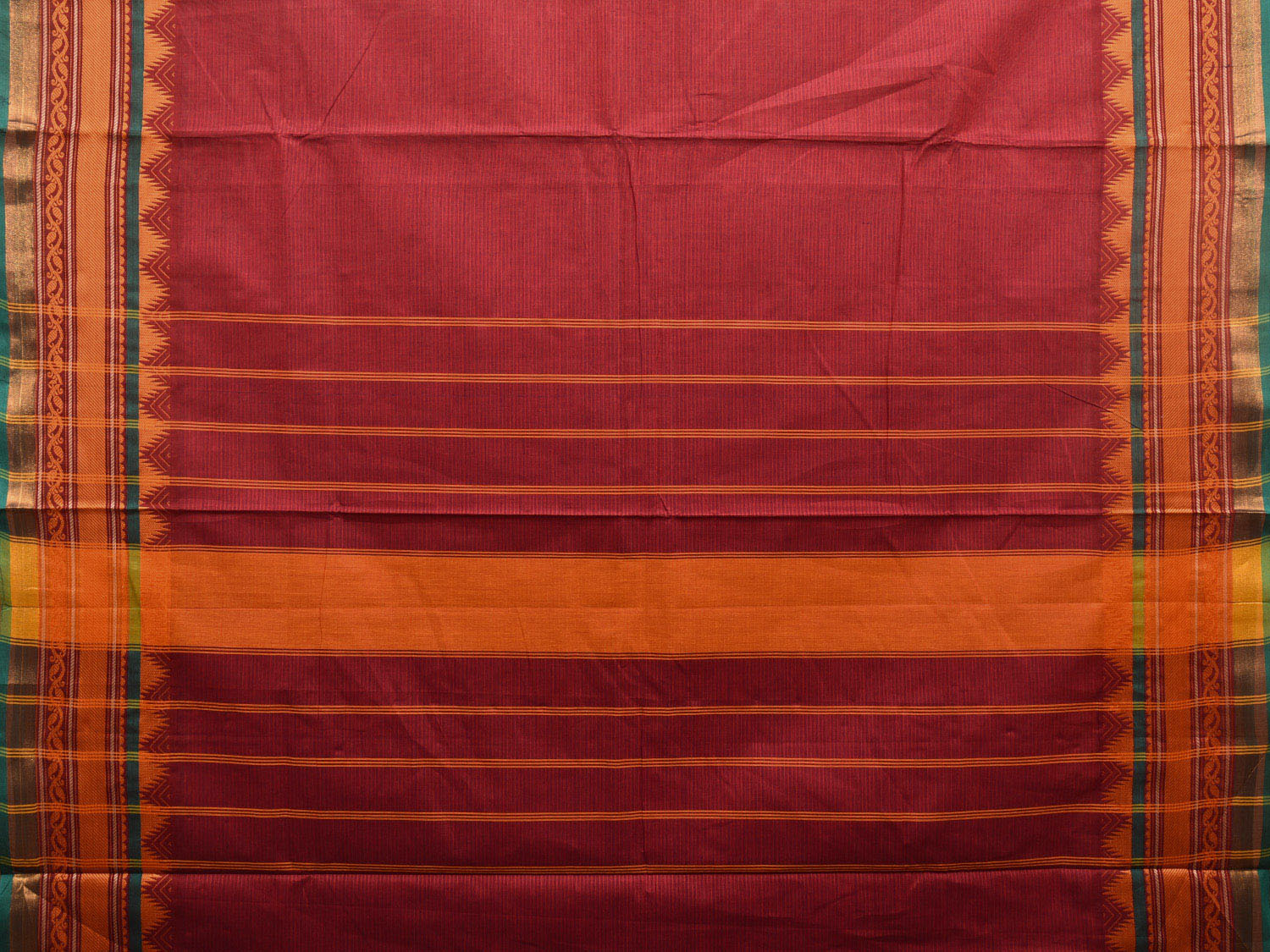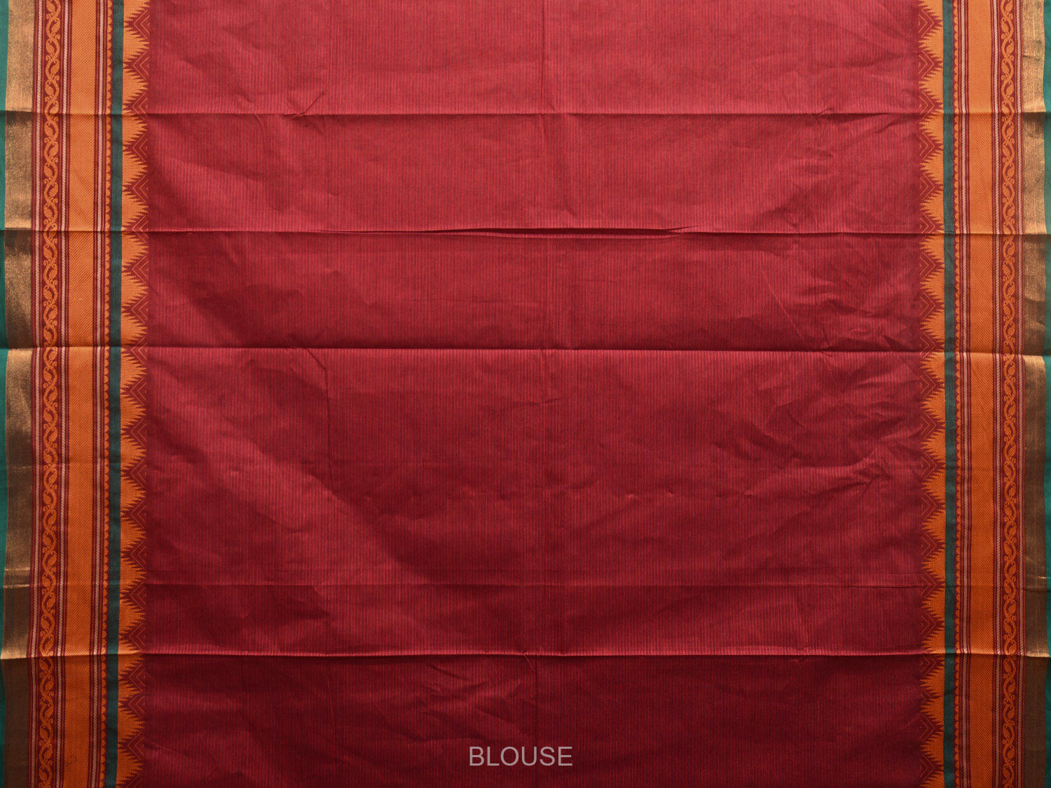 Dark Red Kanchipuram Cotton Saree with Strips Pallu and Temple Border Design k0693