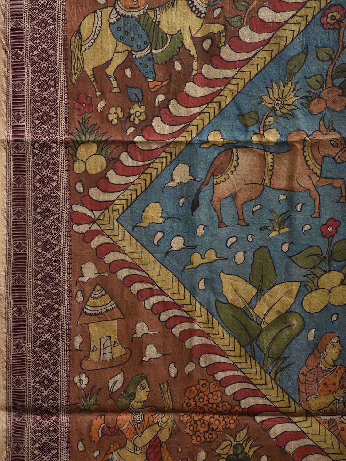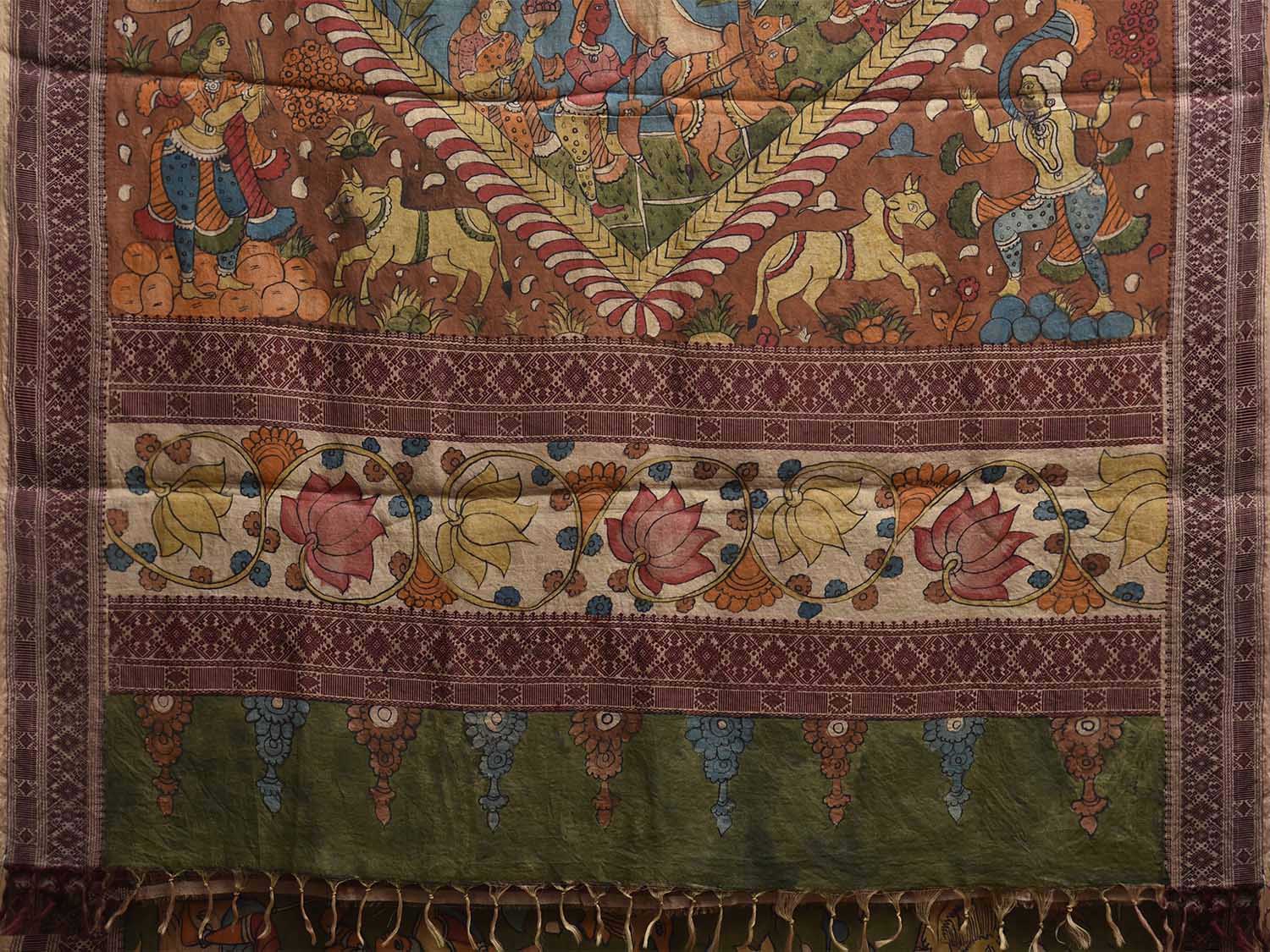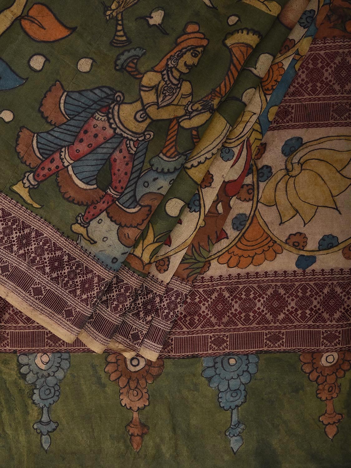 Green and Fawn Kalamkari Hand Painted Tussar Handloom Saree with Village Theme Design KL0835