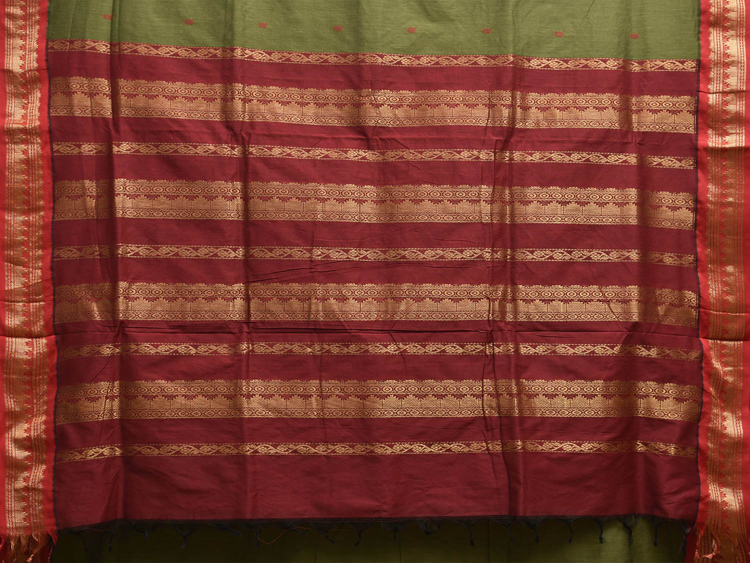Green and Maroon Gadwal Cotton Viscose Saree with Border and Pallu Design. Gadwal Sarees are known for their tradtional design of border and pallu made of silk and body being either cotton or silk. They are known as Sico sarees for border and pallu being silk and body being cotton. We advice dry clean for fabric care.