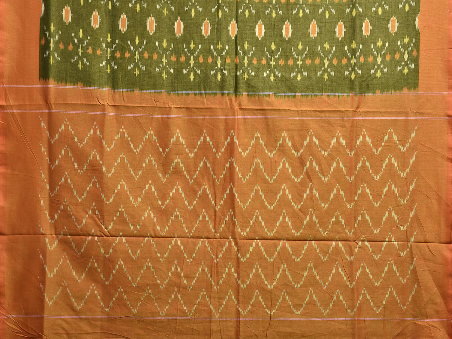 Green and Orange Pochampally Ikat Cotton Handloom Saree with Buta and Zig-Zag Pallu Design No Blouse i0921