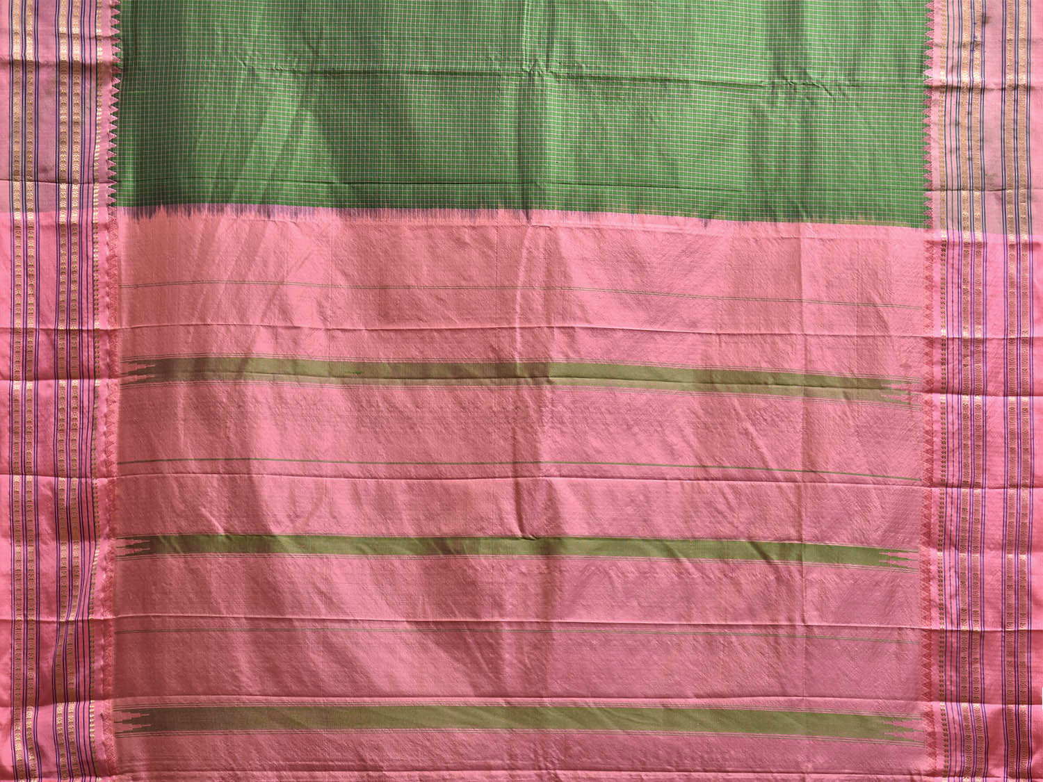 Green and Peach Narayanpet Silk Saree with Checks Design np1222