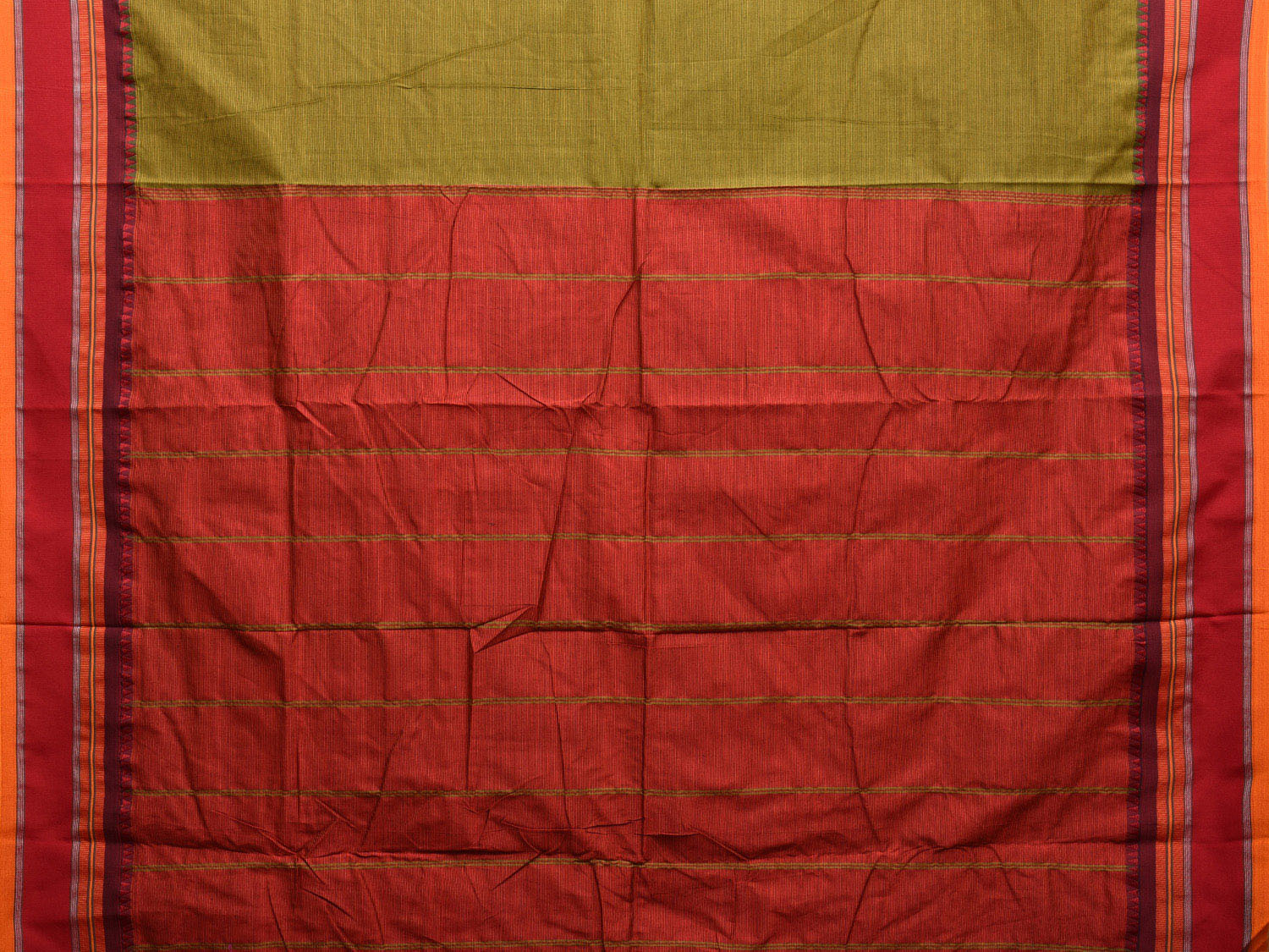 Green and Red Poly Cotton Saree with Strips Body and Pallu Design. We advice gentle handwash separately for fabric care.