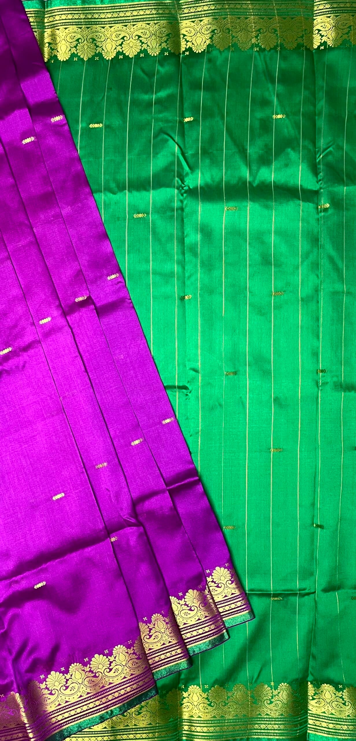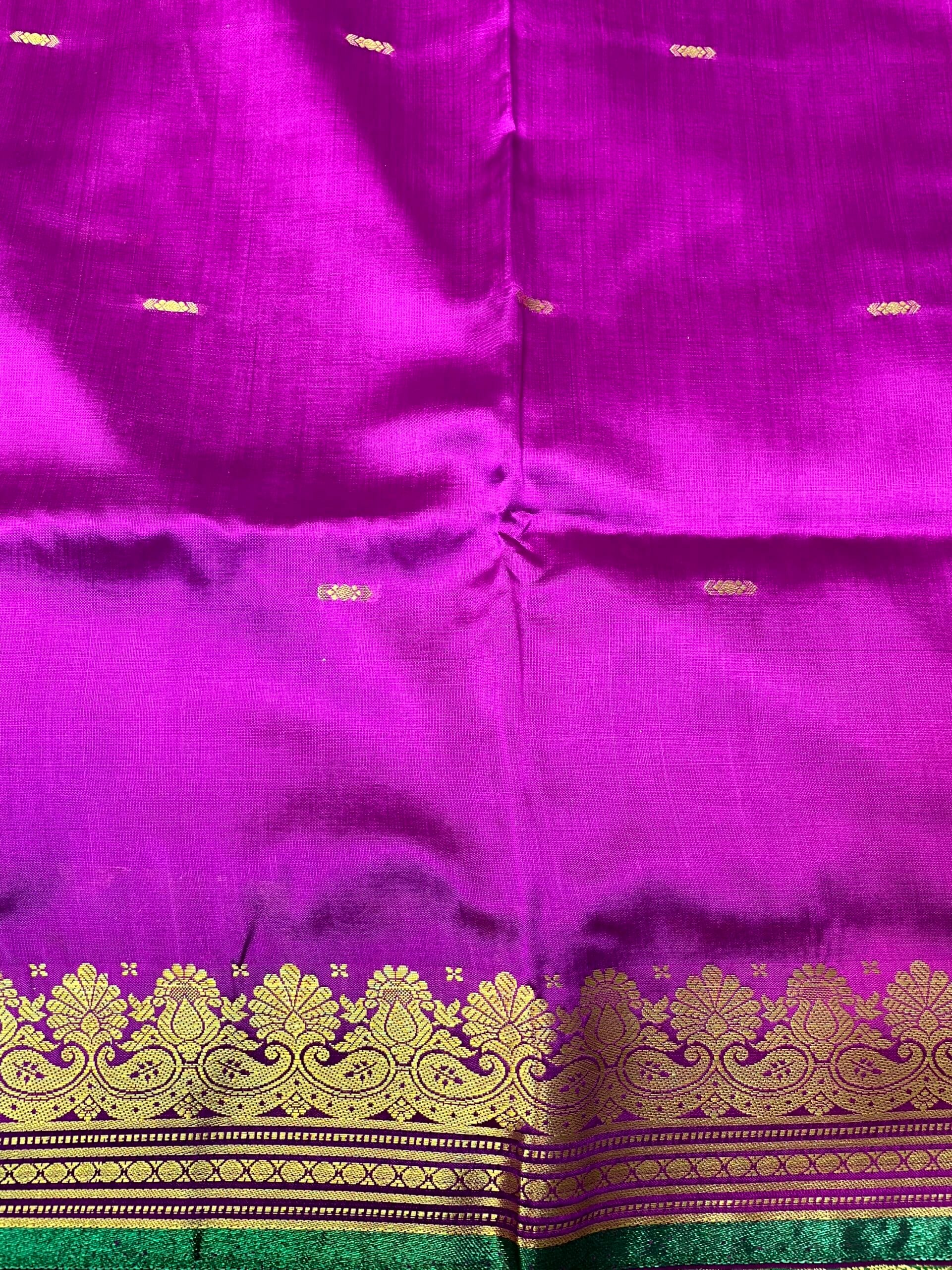 Green and Violet Banaras Viscose Silk with Intricate Kanchivaram Border and Body Butta Design