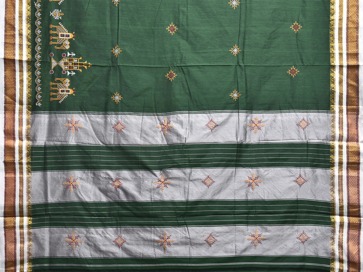 Green and White Kasuti Work On ilkal Cotton Viscose Saree with Contrast Pallu Design No Blouse. For fabric care we advise gentle handwash separately. This saree has no blouse.