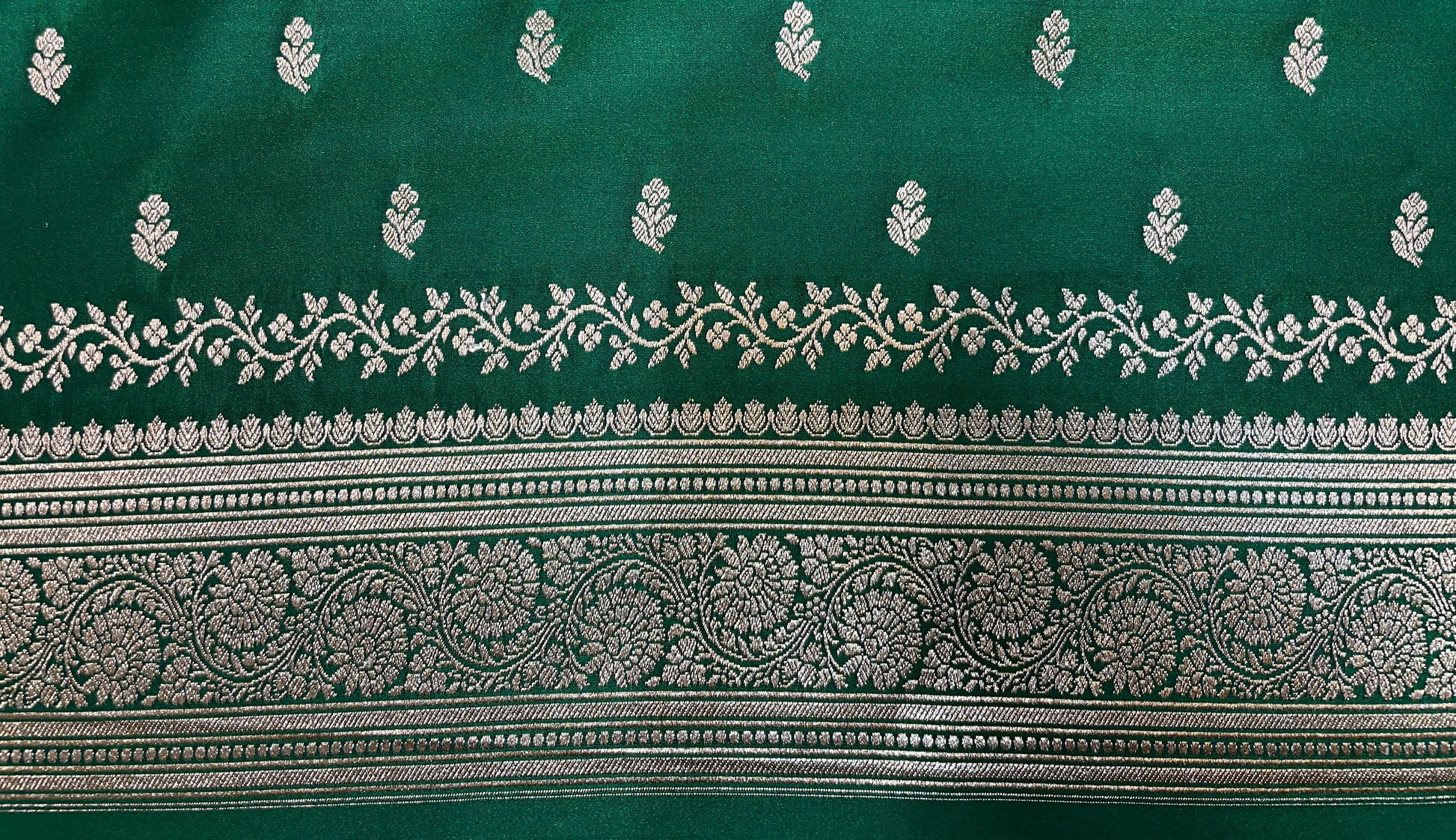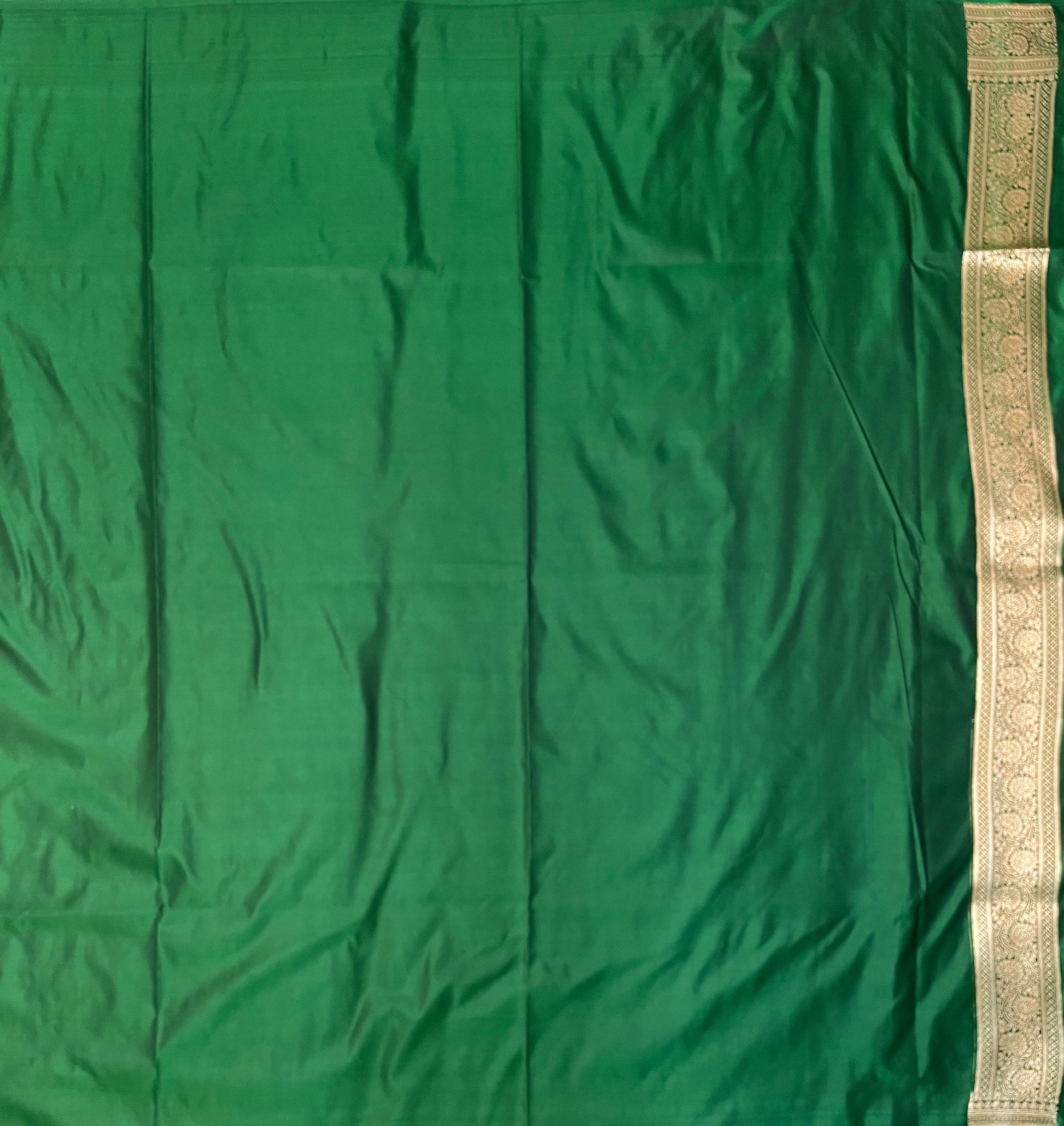 Drape yourself in timeless elegance with this exquisite emerald green Banarasi silk saree, adorned with delicate Gold zari motifs throughout the body. The saree features an intricately woven floral and paisley border, complemented by a regal pallu with detailed brocade craftsmanship that reflects the rich heritage of Banaras.Perfect for weddings, festive occasions, and grand celebrations, this saree brings together tradition and luxury in every drape. The lustrous silk fabric adds a graceful fall and sheen, while the Gold zari creates a stunning contrast that enhances its royal charm.