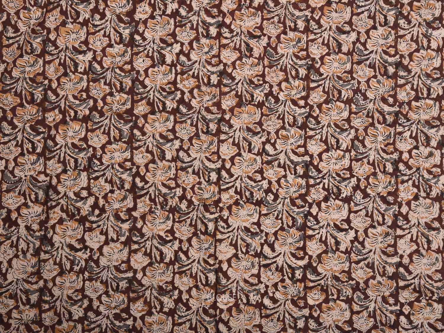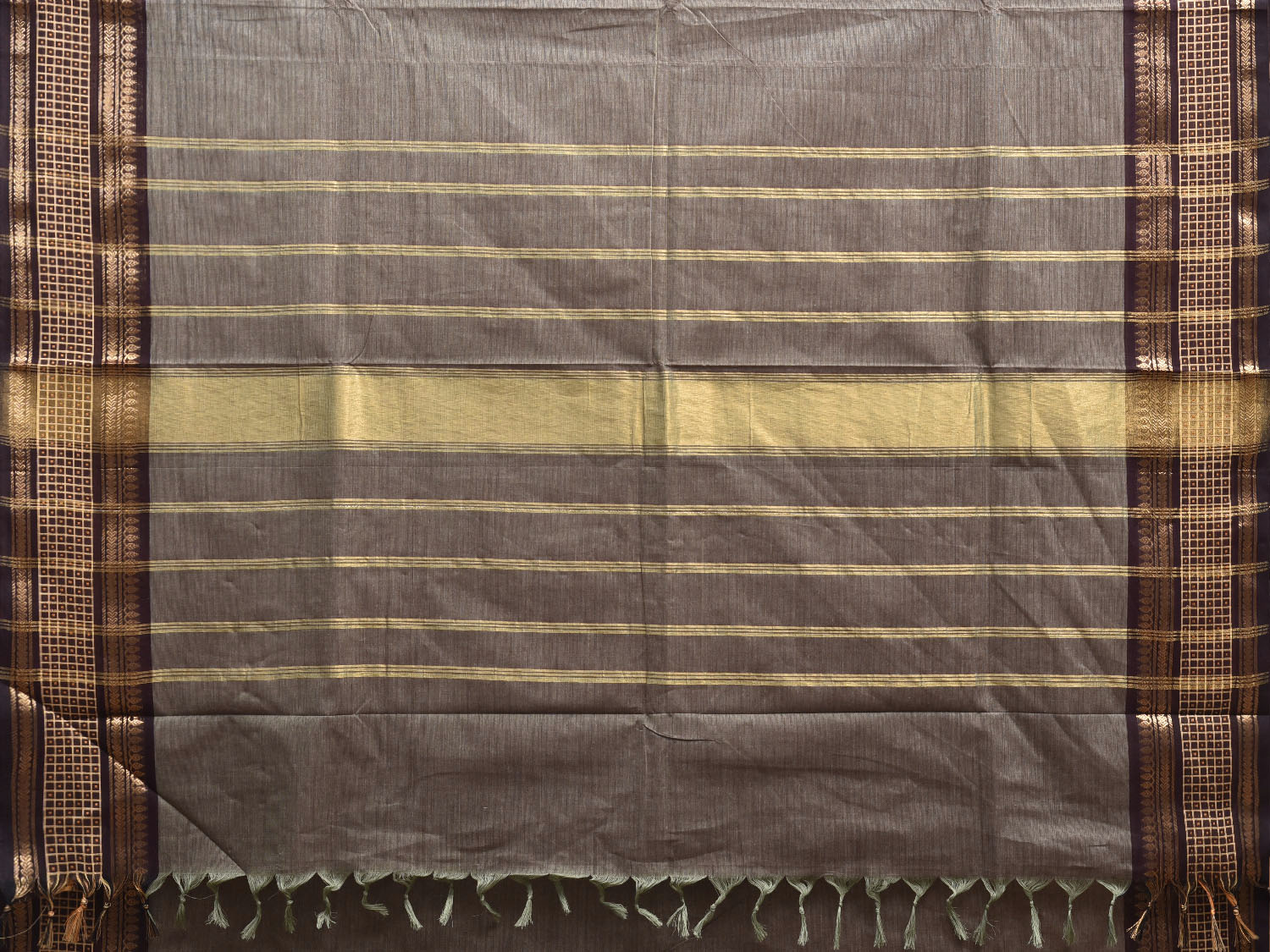 Grey and Brown Kanchipuram Cotton Plain Saree with Strips Pallu Design and Kalamkari Blouse k0995