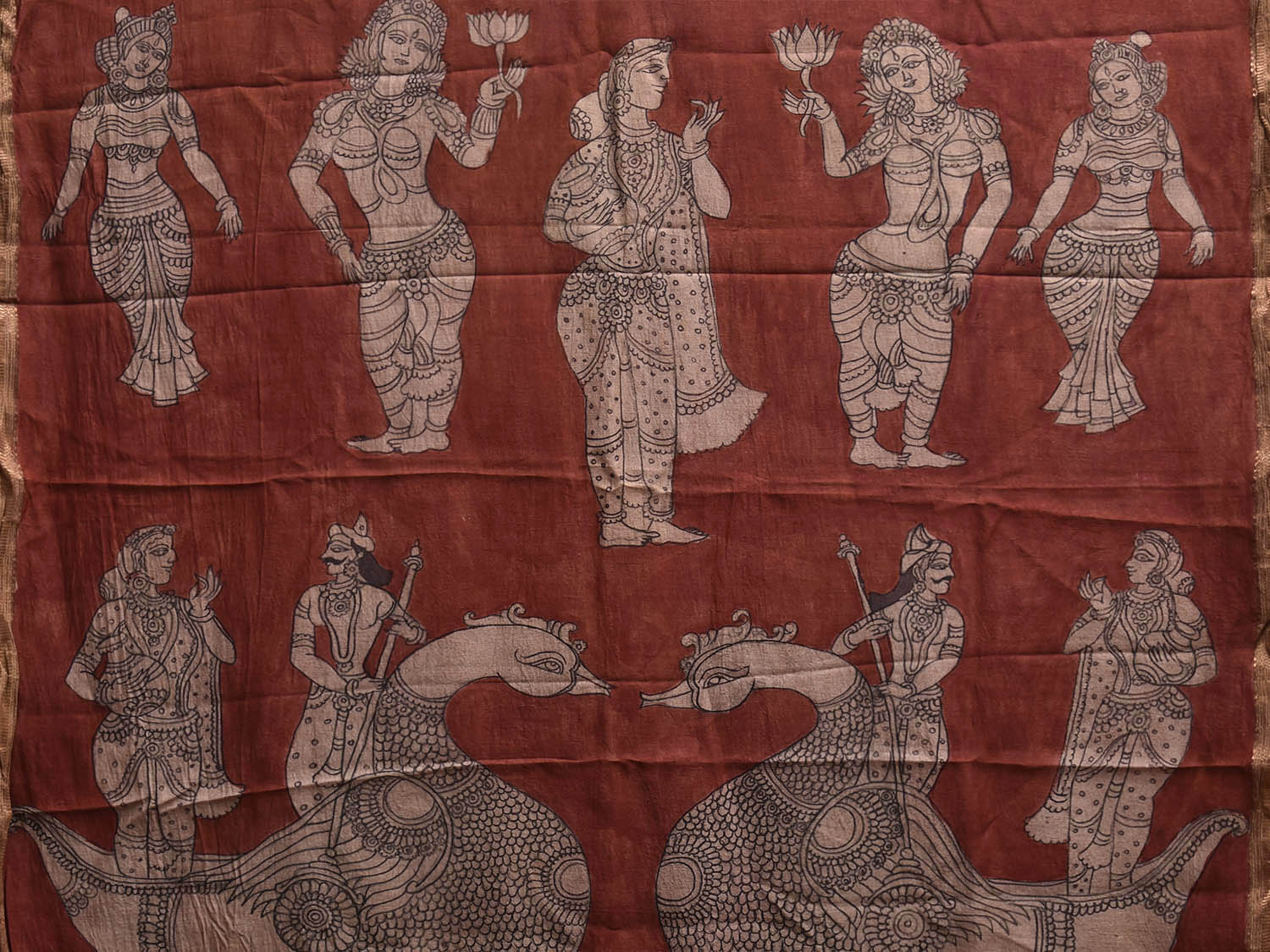 Grey and Red Kalamkari Hand Painted Muga Silk Handloom Saree with Floral and Mythological Design. This hand painted kalamkari is done using natural dyes. As they are natural colors they bleed with initial washes, so we suggest Dry clean.